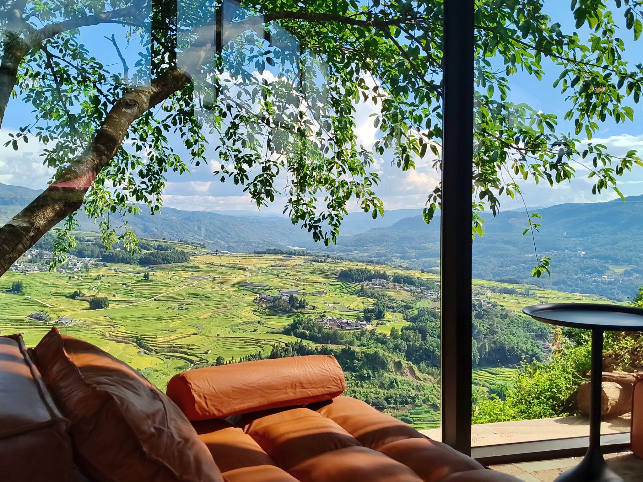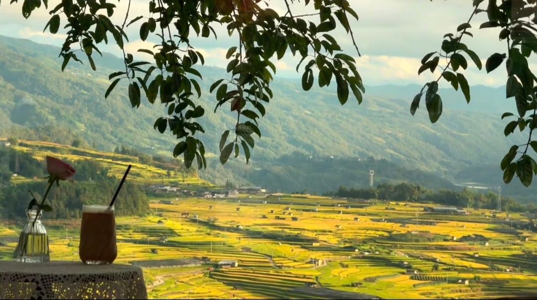 一面洒满阳光、正对梯田的超大落地窗,就是咖啡馆最绝妙的景致。特意前来打卡的游客宁先生说:“在这里能把稻田全貌看完,整片黄绿交织的梯田盛景被框进落地窗,就像是一幅油画。看着这样的风景喝咖啡,实在是太惬意了。”