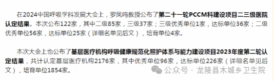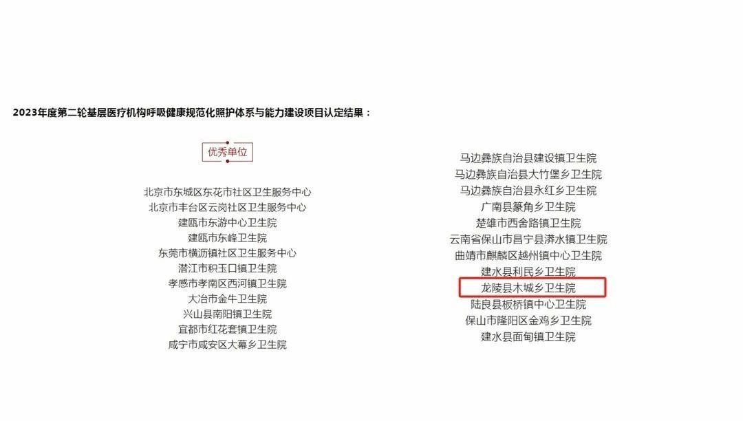 近日,在中国呼吸学科发展大会上公布了2023年度第二轮基层医疗机构呼吸健康规范化照护体系与能力建设项目认定结果,木城乡卫生院榜上有名,荣获“基层呼吸规建优秀单位”!