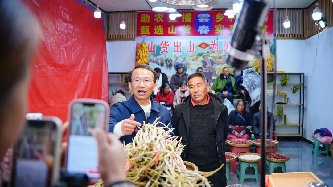 “小杨,来帮我卖点儿石斛,自己种的,不打药不施化肥......”仲冬深夜,在龙陵县平达乡平安村民安园移民搬迁点,热闹的助农直播像往常一样正在进行。十多位村民带着自家种的石斛、白芸豆、核桃等特产轮番上前,主播杨根余对着镜头展示起了这场直播的货品。