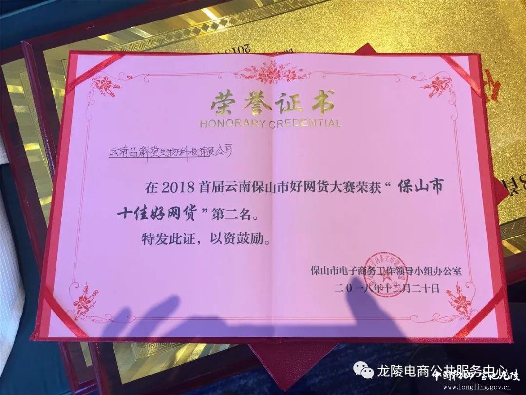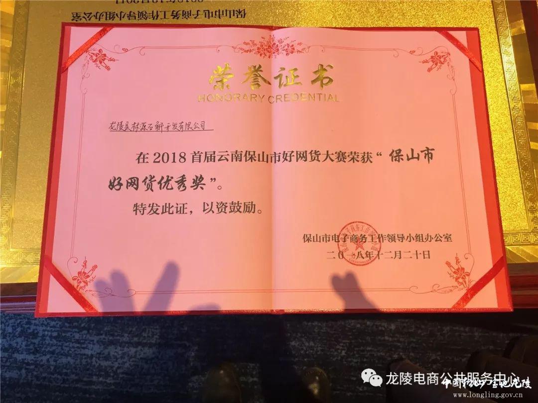 2018首届保山市好网货大赛决赛于12月20日在昌宁县三川大酒店举行。保山市政府党组成员、市政府办公室党组书记庄宇,保山市商务局副局长、保山市电子商务工作领导小组办公室主任赵兴芳,保山市昌宁县人民政府副县长李惠铭以及隆阳区、腾冲市、施甸县、龙陵县人民政府分管领导和市电商工作领导小组成员单位分管领导等出席本次决赛。龙陵县晋级决赛的产品有云南品斛堂生物科技有限公司一品斛·nano石斛酒、云南省龙陵县龙眉茶业开发有限责任公司金螺滇红茶、龙陵县林源石斛开发有限公司紫皮石斛鲜条。