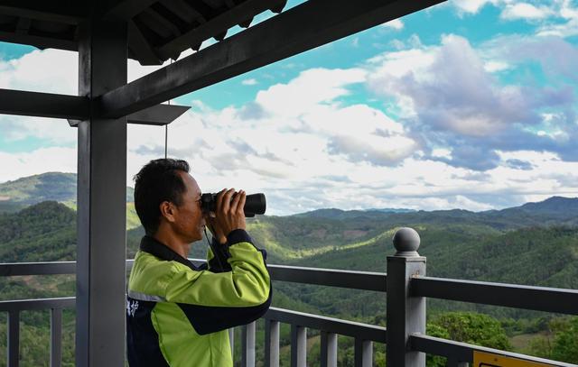 在思茅区六顺镇一座数米高的观测塔上,杨忠平正手持望远镜,瞄准远处的密林。