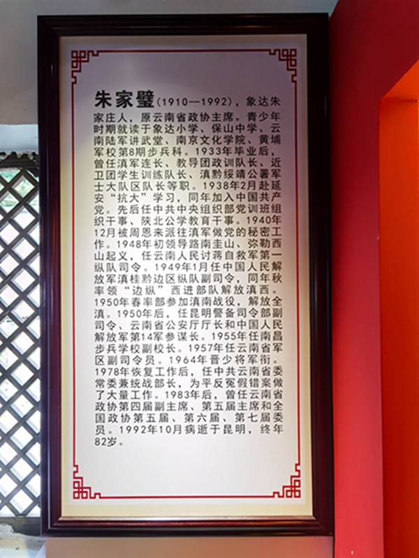 朱家璧同志于1910年3月出生在龙陵县象达镇朱家庄,曾就读于象达小学、云南陆军讲武堂、南京文化学院、黄埔军校。1933年毕业后曾任滇军连长,教导团政训队长等职务。1938年奔赴延安“抗大”求学,同年加入中国共产党,先后任中共中央组织部党训班组织干事,陕北公学教育干事,1940被周恩来派往滇军做党的秘密工作,1948年领导了路南圭山、弥勒西山起义,任云南人民讨蒋自救队第一纵队司令,1949年在中国人民解放军滇桂黔边区纵队副司令,同年秋率领纵队西进部队解放滇西,1950年参加了滇南战役,解放全滇,之后任昆明警备司令部任副司令、云南省公安厅厅长和中国人民解放军第14军参谋长,1964年晋升为少将军衔,1978年恢复工作之后,任中共云南省委常委统战部部长,为平反冤假错案做了大量工作,1983年后,曾担任云南省政协第四届副主席、第五届主席和全国政协第五届、第六届、第七届委员。1992年10月病逝于昆明,终年82岁,将军把毕生的心血都献给了革命事业、献给了党和人民。