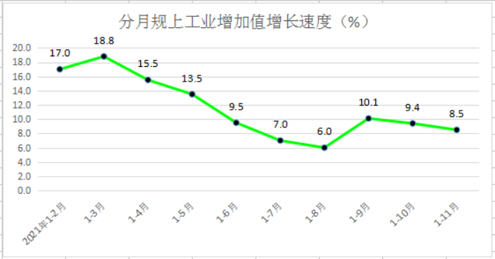 2021年1-11月全县规模以上工业增加值增长8.5%,两年平均增长8.2%,比1—3月下降10.3个百分点、比1—6月下降1百分点,比1—9月下降1.6百分点,比10月下降0.9个百分点,比全市增速5.9%高2.6个百分点,比隆阳、施甸、昌宁分别高9.3、9、1.7个百分点,比腾冲低4.2个百分点,在全市排第2位。从行业看,在全县13个工业大类行业中,有5个行业实现增长,8个行业下降,增长面仅为38.5%,龙陵县规模以上工业增加值增速下降趋势明显,规上工业经济运行面临四难。