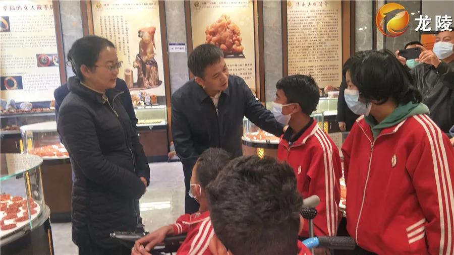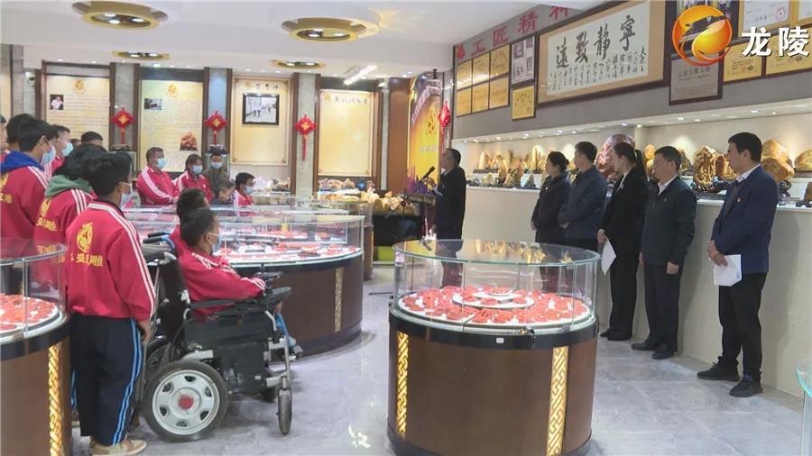 省残联党组书记、理事长赵正富为龙陵华盛玉雕创艺厂授牌并指出,龙陵华盛玉雕产业基地被授予全国残疾人文化创意产业基地,得益于龙陵县党委政府关心支持残疾人教育事业,也得益于社会有爱心、有情怀的企业家大力支持,更得益于残疾人同学努力拼搏创造的不凡业绩。希望残联系统和残疾人工作者立足本职,强化宣传引导和监督管理,做好残疾人文创产品展示窗口,扶持一批残疾人文创技能人才。通过典型带动,示范引领,全面推进保山市残疾人文创产业发展,促进残疾人实现高质量就业创业。要求基地要积极开拓创新,进一步突出区域特色,继续发挥平等互助、合作交流、共同发展的平台作用,引领残疾人在文创领域实现高质量就业创业,促进残疾人文化产业健康发展,为巩固拓展脱贫攻坚成果同乡村振兴有效衔接增添新动能;全体老师要发扬“有大爱才有大德”的精神,用心呵护每一名残疾学生健康快乐成长;同学们要珍惜机会,做到身残志坚,勤学苦练,在学校的教育下茁壮成长、成才,走向社会实现自身价值。同时希望社会各界继续关心关爱残疾人事业,共同促进“残健共融”,让残疾人充分参与经济、社会建设,共享发展成果。