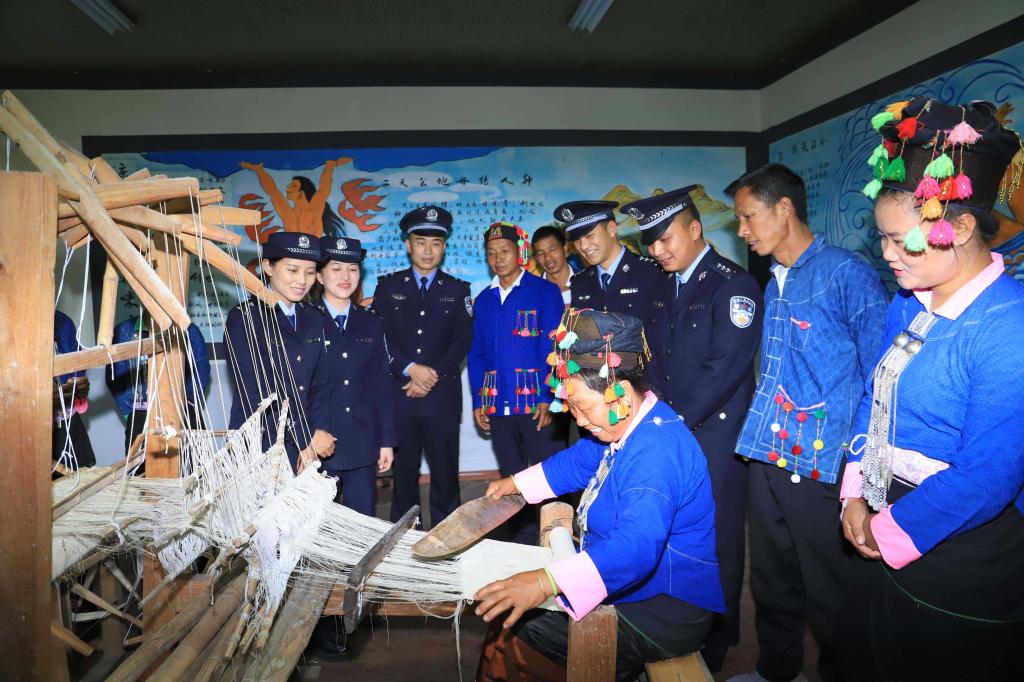 在阿昌族村民的带领下,派出所民辅警走进阿昌族文化展览馆,了解阿昌族习俗文化,走进阿昌山寨,了解阿昌族村容村貌和居住环境,走进阿昌族群众家中,了解阿昌族群众的生产生活情况和遇到的困难。民警与“亲人们”围坐在火塘边拉家常,共叙警民情,向他们征求市域社会治理现代化创建的意见建议;在篱笆小院里,宣讲党的政策方针和法律法规,阿昌族群众说着感谢的话语,将阿昌帽儿戴给所长赵尚文,所长瞬间变身阿昌小伙,寓意“我视你为亲人”,更加贴近了警民的心。