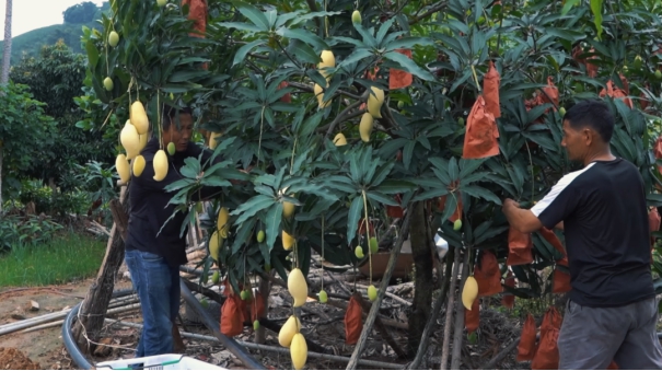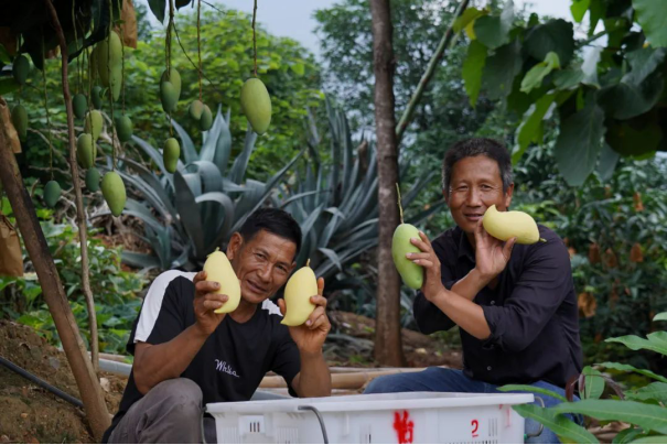 看着身边的果农收益不错,起步较晚的果农邹桂聪也于2017年开始尝试种植了4亩,随后又慢慢扩大面积,去年他迎来了第一季芒果收入。他说:“我是2017年种的芒果,去年投产10亩左右卖了2万多,今年有25亩左右,要卖6万左右。镇上和村上每年都会来指导我们种植芒果,种植大户也会和我们分享技术。”