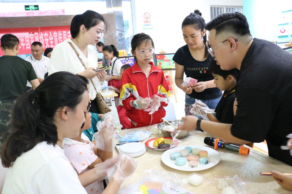 活动最吸引孩子们注意的莫过于手工冰皮月饼制作环节,在了解制作流程后,家长和孩子们一起动手完成了捏面团、包馅、压花等环节,尽情享受亲手制作月饼带来的喜悦。