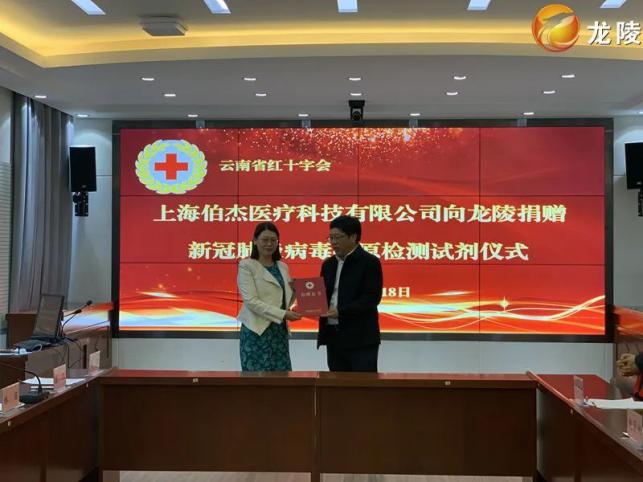 捐赠仪式上,上海伯杰医疗科技股份有限公司向龙陵县疫情防控指挥部递交捐赠牌;云南省红十字会一级巡视员梁先平向上海伯杰医疗科技股份有限公司颁发了捐赠证书。