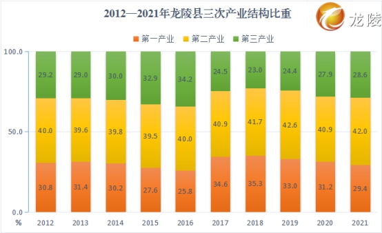 2021年,全县实现第一产业增加值39.76亿元,较2012年增加25.57亿元,年均增长6.5%。第一产业增加值在全省排名从2012年第44位升至第30位,上升14位。实现第二产业增加值58.41亿元,较2012年增加39.95亿元,年均增长14.2%,第二产业增加值在全省排名从2012年第66位升至第39位,上升27位。实现第三产业增加值40.88亿元,较2012年增加27.41亿元,年均增长9.1%。2021年全县三次产业结构为28.6:42.0:29.4,与2012年的30.8:40.0:29.2相比,第一产业比重下降2.2个百分点,第二、第三产业比重分别提高2个、0.2个百分点,三次产业结构由“二一三”调整为“二三一”结构。