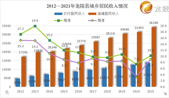 居民收入持续增长。2021年,全县实现城镇居民人均可支配收入34286元,较2012年增加17005元,增长1倍,年均增长9.5%;农村居民人均可支配收入13914元,较2012年增加9173元,增长1.9倍,年均增长12.2%。城乡居民收入差距逐步缩小,城乡居民收入比从2012年的3.65:1缩小至2021年的2.46:1。