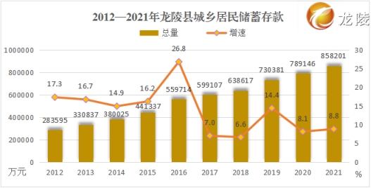 居民家庭存款持续增加。2021年,全县城乡居民储蓄存款余额85.82亿元,较2012年增加57.46亿元,增长2倍,年均增长13.5%。城镇居民人均生活消费支出23970元,较2012年增加11807元,增长近1 倍,年均增长7.8%;农村居民人均生活消费支出14013元,较2012年增加9693元,增长2.2倍,年均增长12.9%。城乡居民消费支出比由2012年的2.81:1缩小至2021年的1.71:1。