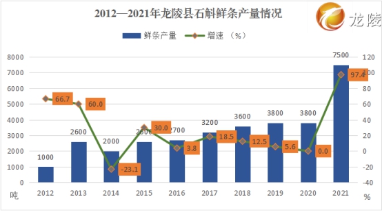 2021年,全县种植石斛36000亩,较2012年增加28514亩,增长3.8倍,年均增长23.6%。实现石斛鲜条产量7500吨,较2012年增加6500吨,增长6.5倍,年均增长28.7%。