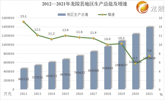 2021年,全县实现地区生产总值139.05亿元,同比增长7.4%,增幅位居全省第82 位,较2012年增加92.94亿元,年均增长10.6%,在全省129个县(市、区)中排名从2012年的第68位提升至第60位,上升8位,经济总量占全市的比重从2012年的11%提高至11.9%,提高0.9个百分点。人均GDP稳步提高,2021年突破5万元,达51233元,较2012年增加34776元,增长2.1倍,年均增长10.2%,在全省129个县(市、区)中排名从2012年的第73位提升至2021年的第57位,提升16位。