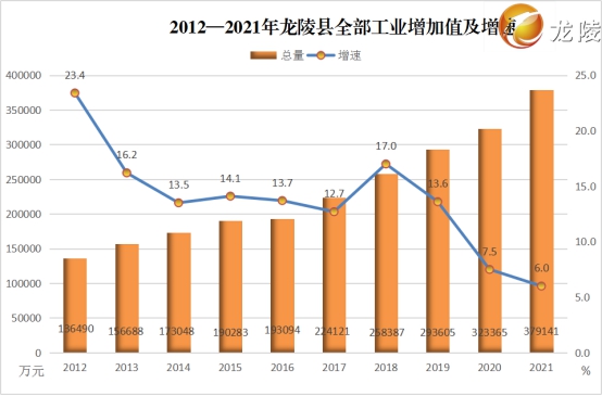 县委、县政府坚持把工业作为经济发展的主要抓手,立足新发展理念、构建新发展格局、推动高质量发展,不断加快工业转型升级,推动水电硅材、中药饮片等优势产业的发展,全力打造全市工业经济新增长极,工业强县战略成效进一步显现。2021年,全县实现全部工业增加值37.91亿元,较2012年增加24.27亿元,增长1.8倍,年均增长13.7%,全部工业增加值占GDP的比重稳定在30%左右。全县规上工业企业达39户,是2012年的3倍;规模以上工业现价总产值146.33亿元,是2012年的4.6倍;企业营业收入141.01亿元、利润总额20.68亿元、利税总额26.41亿元,分别是2012年的5.2倍、4.5倍和11.7倍,年均分别增长20.4%、25.6%和21.8%。