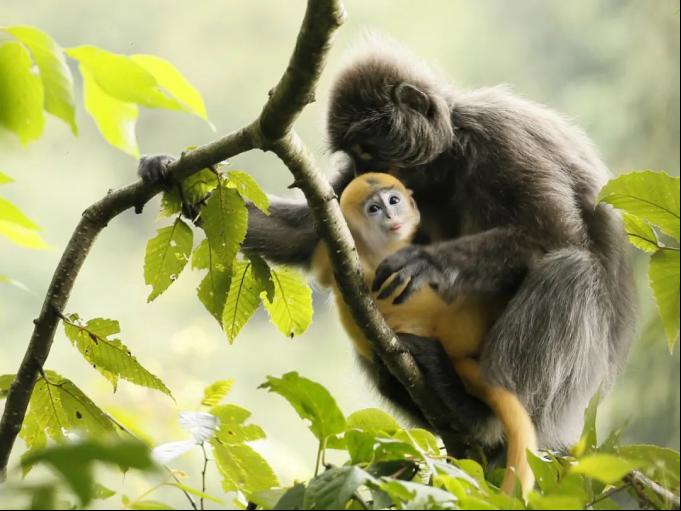 画面中,菲氏叶猴幼崽在母猴的保护下,或在岩石上蹿上跳下、或在树枝上悠闲自得、或在母亲怀抱中撒娇玩耍,行动非常灵敏,萌萌的模样十分惹人喜爱。菲氏叶猴于2021年2月25日列入《国家重点保护野生动物名录》,保护级别为一级,主要生活在高黎贡山及中缅边境热带及亚热带茂密的阔叶林中。画面显示,菲氏叶猴幼崽3-4月以前通体金黄色,非常耀眼,大约5月龄后开始变淡变灰。