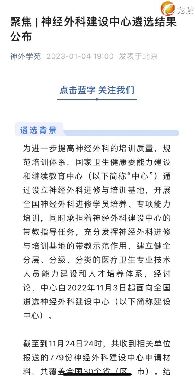 2022年11月,国家卫健委能力建设和继续教育中心在全国范围内组织开展“神经外科建设中心”遴选工作,遴选标准包括基本情况、硬件设施设备、人员技术水平、医疗教学等,这项活动旨在通过带教、指导、质控,包括手术、查房、患者管理、科学研究等方面,提升建设中心的规范化诊疗能力,进一步加强神经外科学科队伍的业务能力与服务水平。