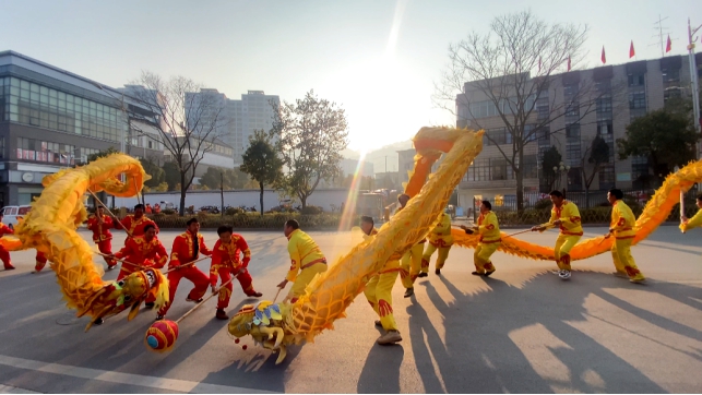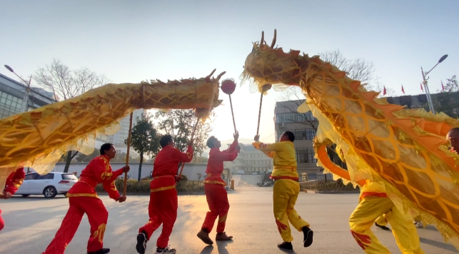 县城大街上,伴着铿锵有力、热闹非凡的锣鼓声,两条金色的长龙在大街上舞动起来。