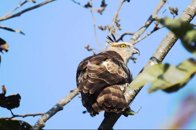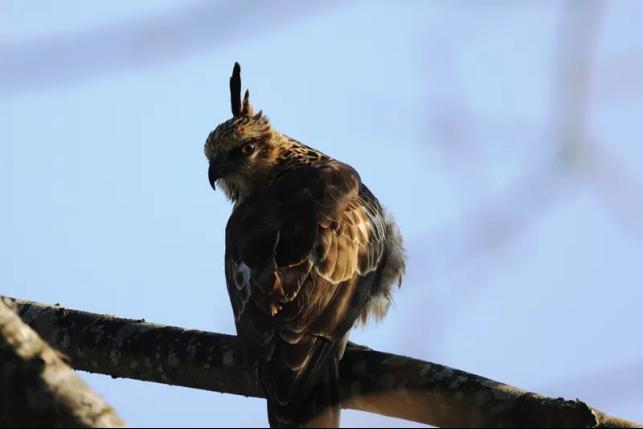 据了解,褐冠鹃隼是鸟纲,鹰形目,鹰科,中型猛禽。头顶有2至3枚羽毛构成的长黑色冠羽,常垂直竖起,尖端为白色。上体褐色,下体白色具黑色纵纹,胸腹部具赤褐色横纹。飞行时两翼尤其近端处甚长且宽,平尾。虹膜黄红色,嘴黑色,脚及腿黄色。主要栖息于丘陵、山地或平原森林,有时也出现在疏林草坡、村庄和林缘,多在晨昏活动。主要以昆虫和蜥蜴、蝙蝠、鼠类、蛙等小型脊椎动物为食。