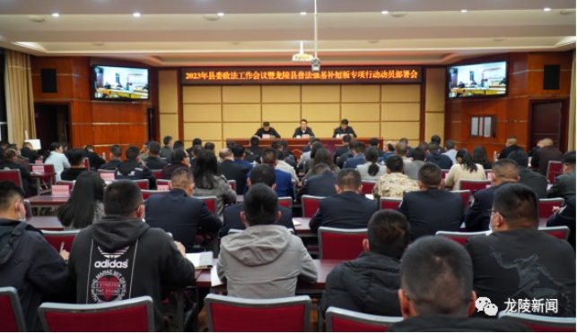 2月21日,龙陵县召开2023年县委政法工作会暨普法强基补短板专项行动动员部署会,研究安排2023年政法工作,部署全县普法强基补短板专项行动。县委书记牛永东出席会议并讲话,会议由县委副书记、县长李永标主持,县委常委、县委政法委书记田德成作工作安排。