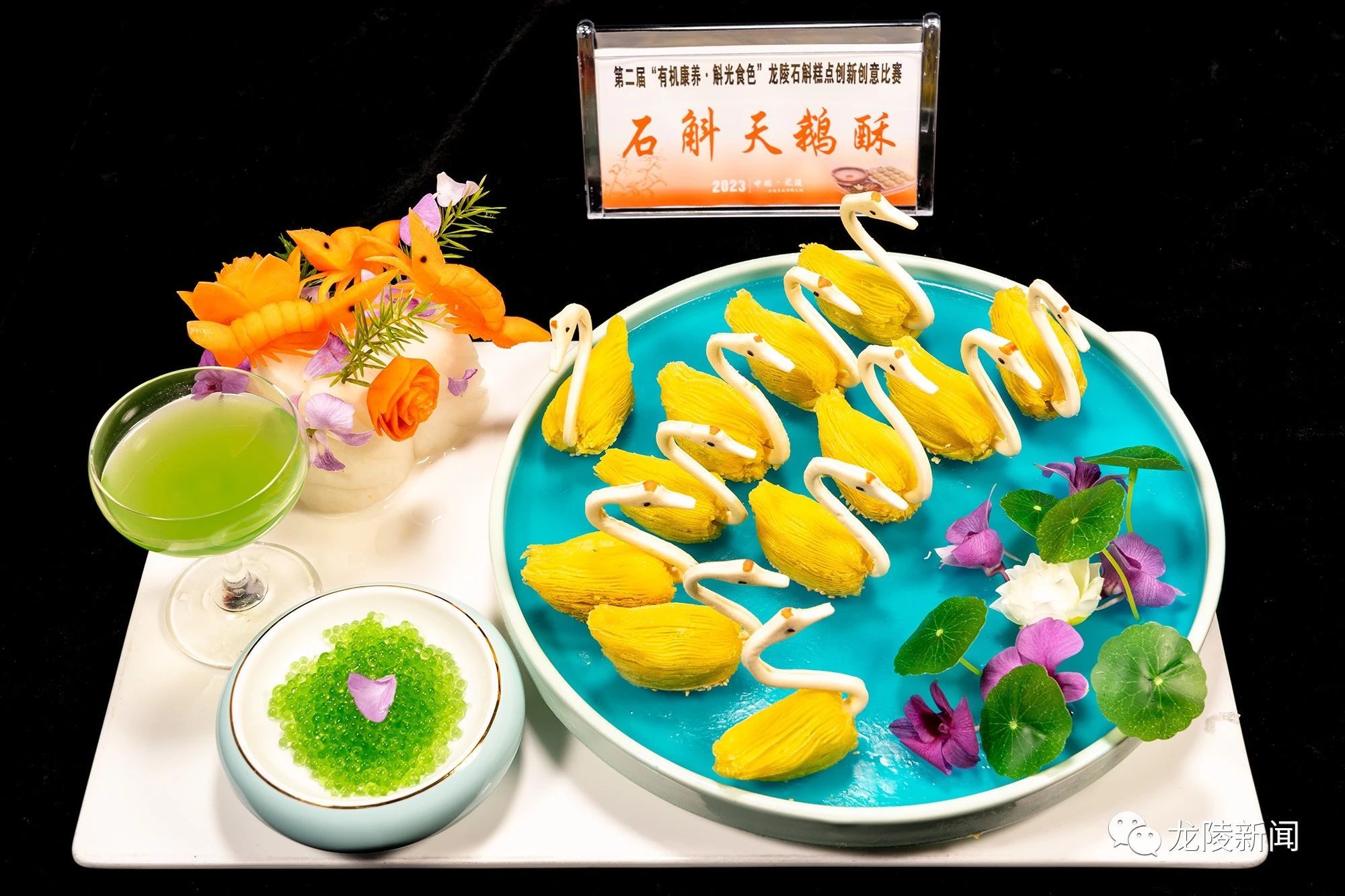 除了石斛枫斗加工,石斛菜肴烹饪和石斛糕点烘焙比赛也开展的“热火朝天”。在石斛菜肴烹饪现场,大厨们纷纷拿出看家本领,通过精湛的厨艺和“大开脑洞”的创新创意,完成了以石斛为原材料的一道固定菜式和自选菜式,为观众呈现出了36道色、香、味俱全的精美石斛菜肴。