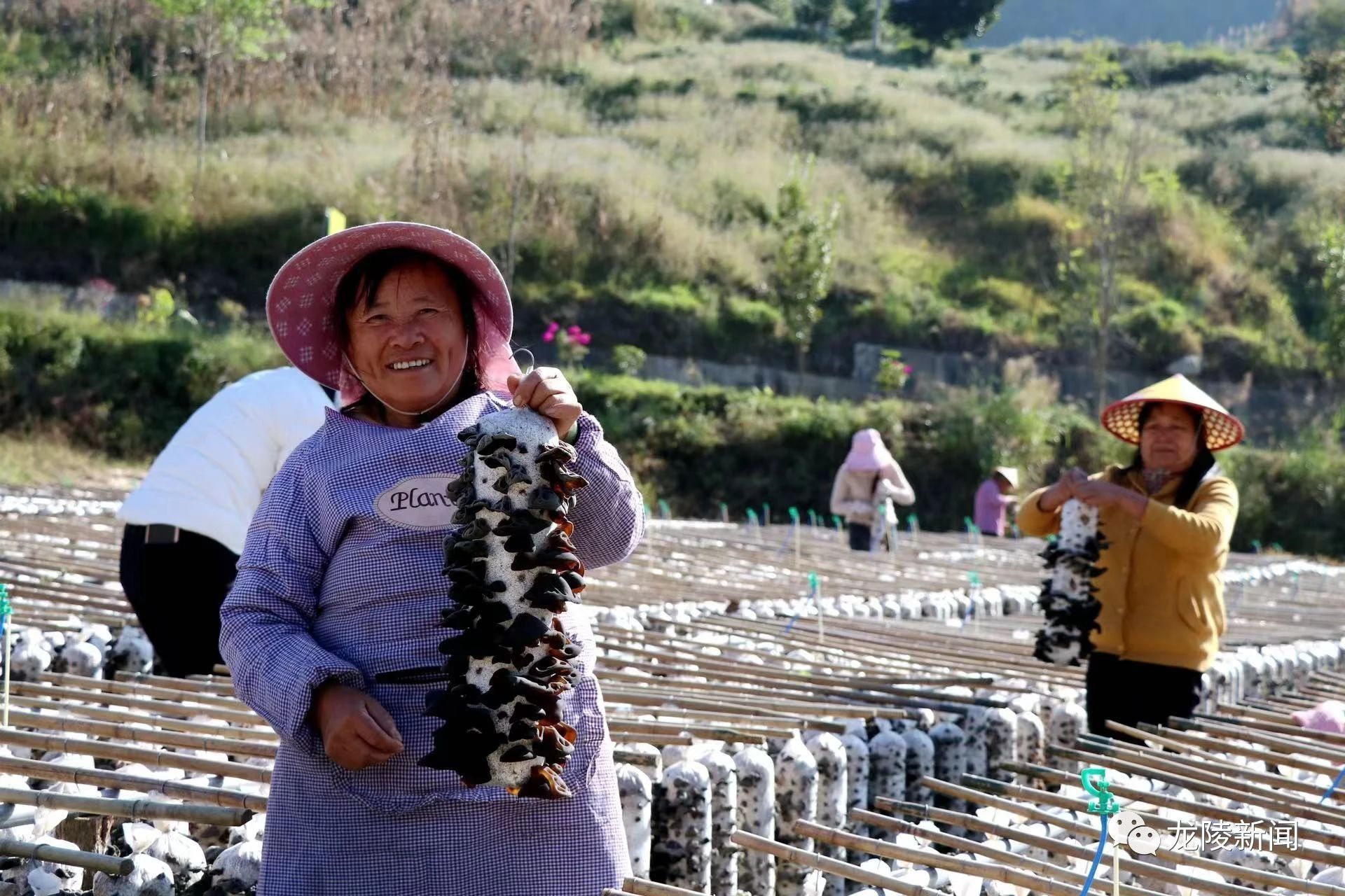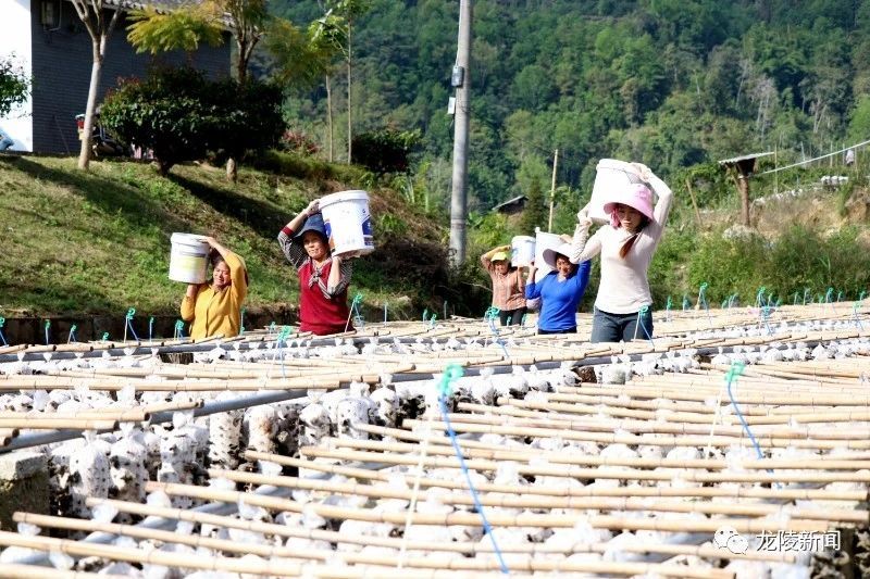 山青树绿、江水流淌、空气清新……龙江乡优越的生态条件,赋予了黑木耳良好的生长环境。只见一块块木耳地上,悬挂起来的圆柱状木耳菌棒上,长满了又黑又大的黑木耳。村民们提着水桶、背着背篓穿梭在菌棒之间,采摘、运输、晾晒,一派繁忙景象。