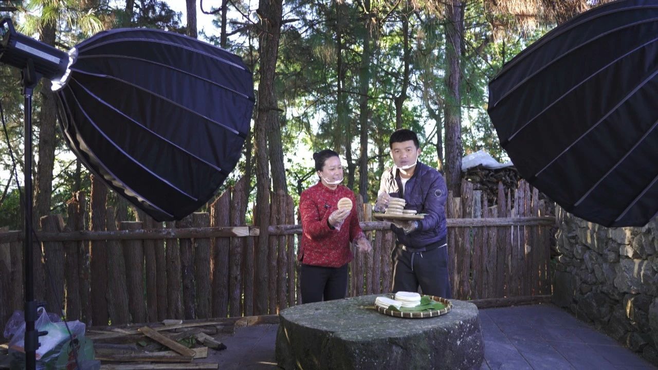 龙陵县大成电子商务公司负责人曹大成,是一位专门推介家乡特产的主播,为了拓展粟米粑粑的销量,把它推向外界,曹大成特意把直播间搬到腊勐镇大垭口社区新村,一边直播舂粑粑一边卖粑粑,让观众实实在在地看到粟米粑粑的制作过程。曹大成在直播间激情高昂地说,“欢迎来到直播间的所有朋友,今天我们是在龙陵的松山,我们给大家准备一些松山的特产,特别是我们当地的粟米粑粑。”曹大成还表示,松山这个地方将一些传统的生活用具保存得特别完好,特别是脚碓,如今又把脚碓重新使用了起来,并且舂制出了粟米粑粑,通过电商平台销往全国各地。