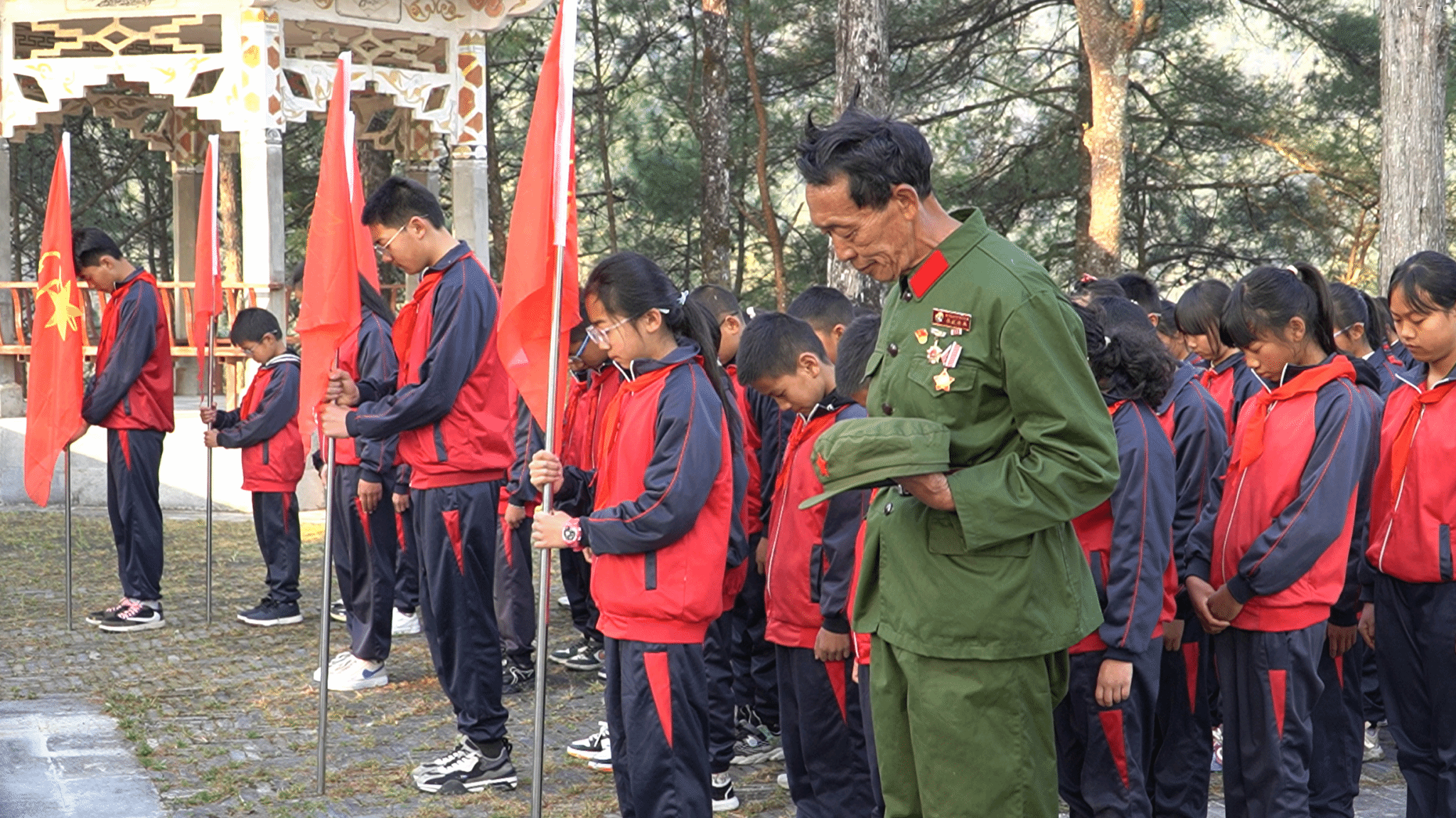 在烈士纪念碑和牺牲战友墓前,66岁的退伍老兵何绩维给同学们分享了自己当兵历程及部队战友们英勇的战斗故事,在老兵平淡真切的言语情感之间让当初激烈的战斗场景和烈士故事在师生脑海中重现。