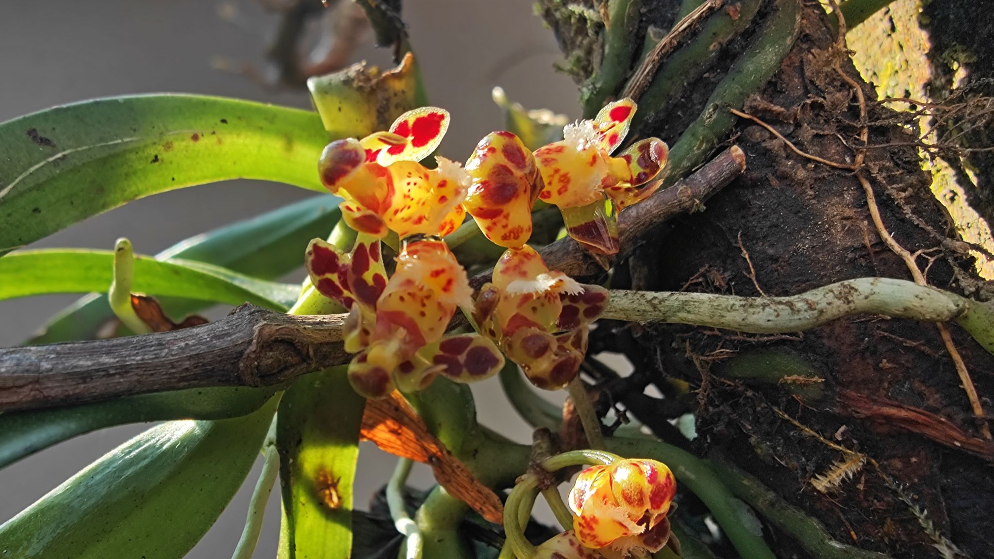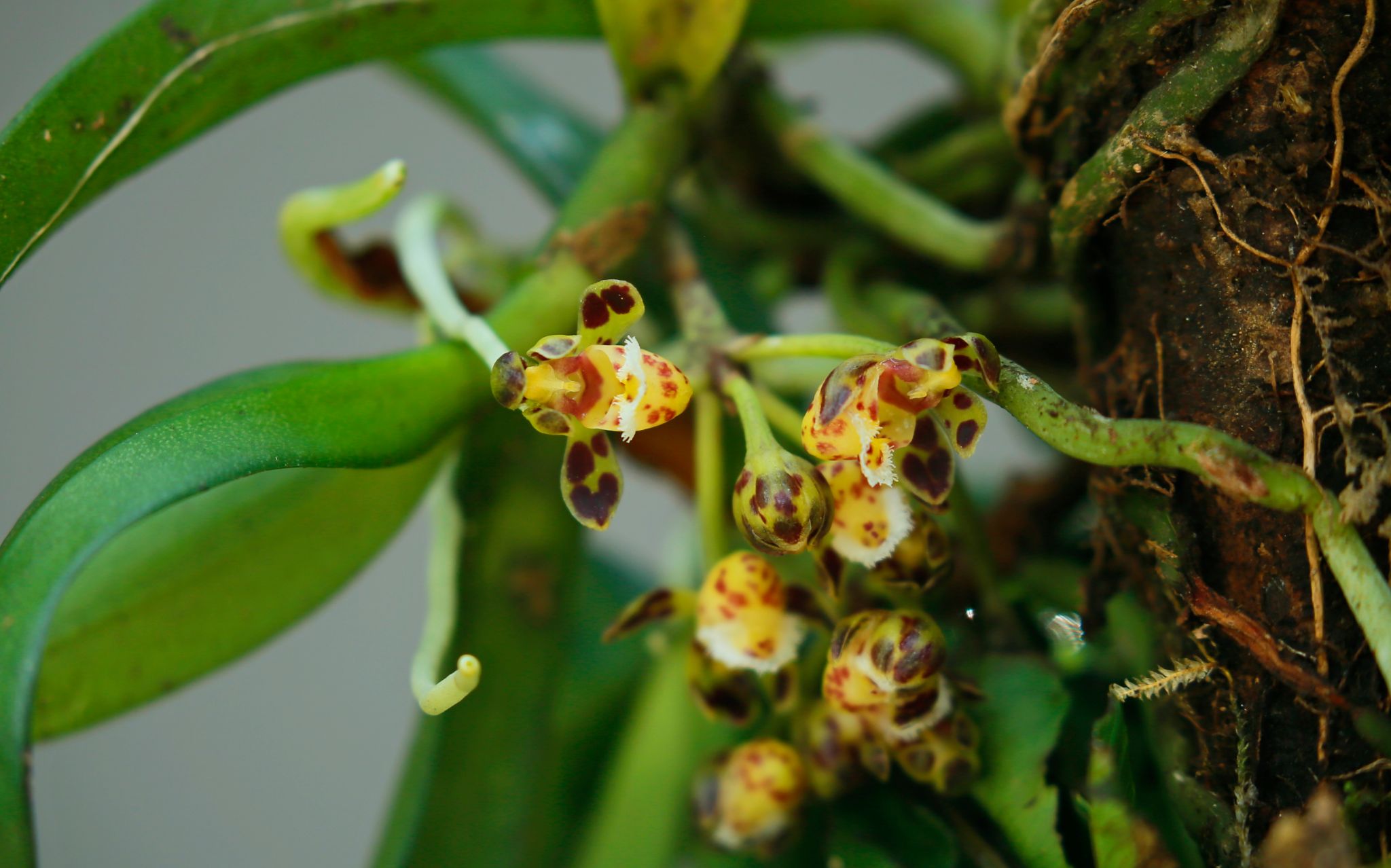 盆距兰的花期通常在每年的三、四月份。眼下正值盆距兰的花期,当这种“毫米级”的花朵微展开时,远看,隐匿在绿叶中的簇簇花团,随风摆动,似乎在欢迎远道而来的客人。近看,花朵晶莹剔透,艳丽而不失优雅,花色多样而不复杂,尤其是小巧玲珑的花朵,酷似小蜜蜂,栩栩如生,令人惊叹不已。