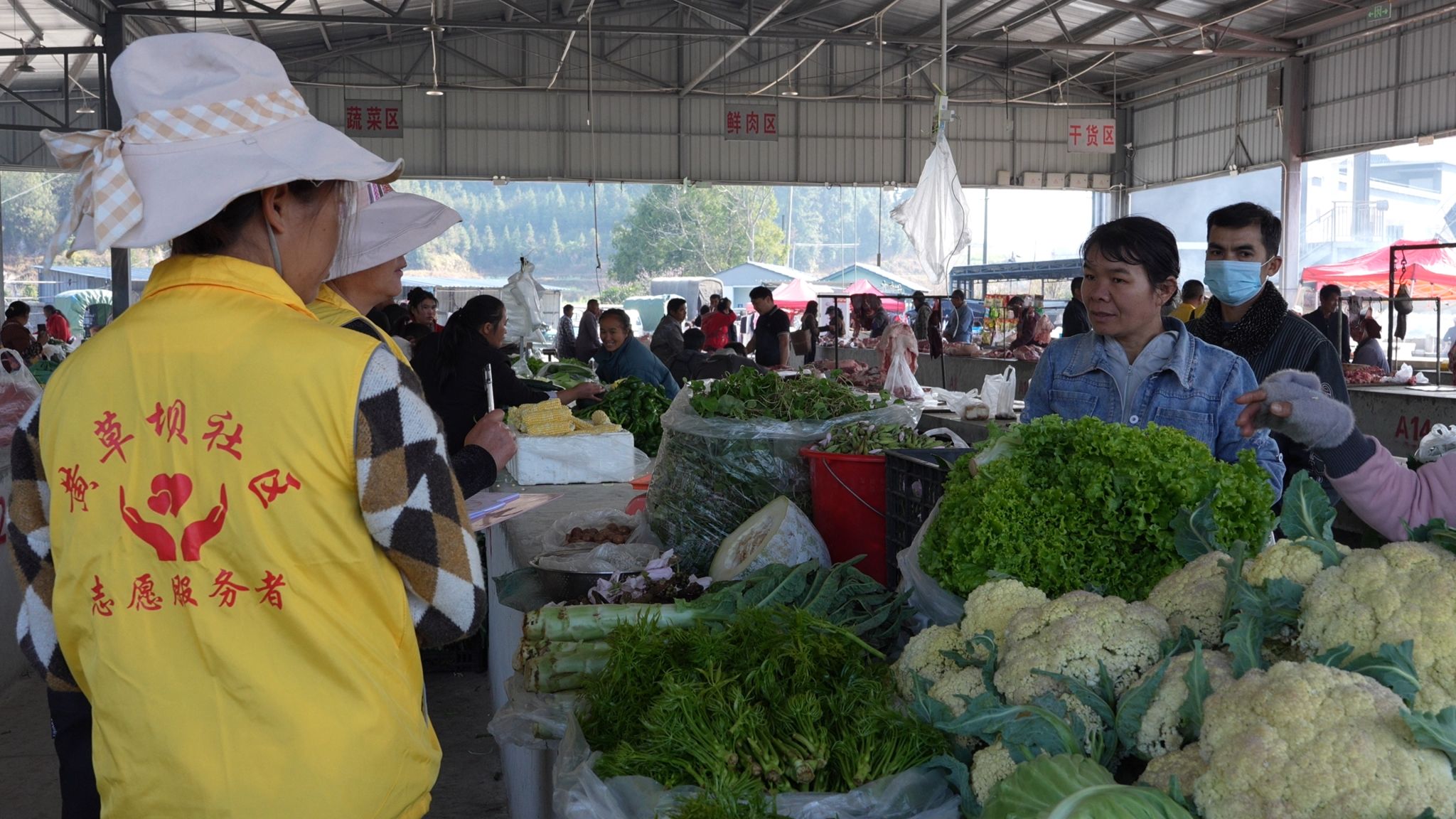 在黄草坝农贸市场里,活禽区、蔬菜区、干货区、服装区、日用品区等功能分区完善。当地逢1号和6号赶集,老百姓称“一六街”。赶集日当天,四面八方的村民聚集在此,售卖各种物品,现场热闹非凡。