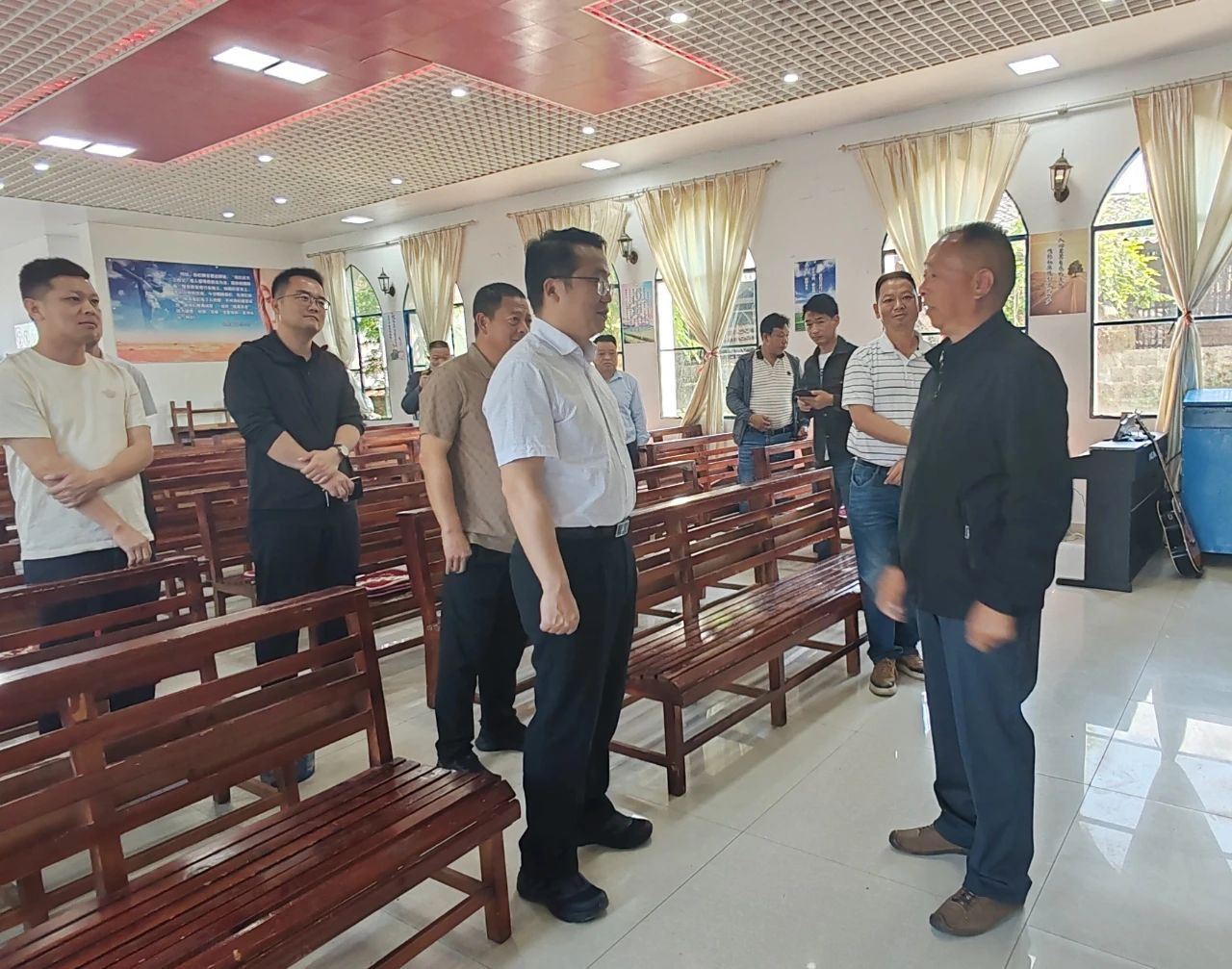 在龙陵县基督教两会,牛永东认真听取负责人关于宗教活动场所规范管理、信教群众组成以及消防安全等情况汇报。他强调,要认真贯彻落实习近平总书记关于宗教工作的重要论述,始终坚持我国宗教中国化方向,依法依规开展宗教活动。要守牢宗教领域安全防线,加强宗教领域重大风险隐患防范化解,深入推进“五进”活动,进一步提升宗教活动场所规范化管理水平,全力营造宗教和顺、社会和谐的良好氛围。