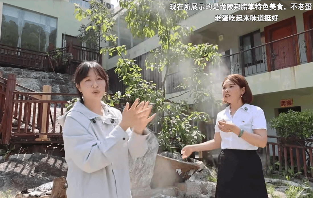 在热气氤氲的邦腊掌温泉景区,主播对功能池、栓象石、岩盘浴、溶洞池、氡氟泉、泉眼集中地、神泉不老蛋、温泉罐、大沸泉、阴阳泉等逐一作了介绍。被誉为“神汤奇水”的邦腊掌,有泉眼600余孔,最高水温达104℃,仅在0.4平方公里区域内就有氡氟泉、碳酸泉和硫磺泉等多种温泉,堪称“温泉博物馆”。“邦腊掌温泉含有23种微量元素,对心脑血管疾病和风湿病、皮肤病等均有较好疗效,因其水质独特、最具活跃性被专家誉为‘地球穴位’。”主播热情耐心地向大家做着介绍,充分展现了龙陵温泉养生文化的魅力。