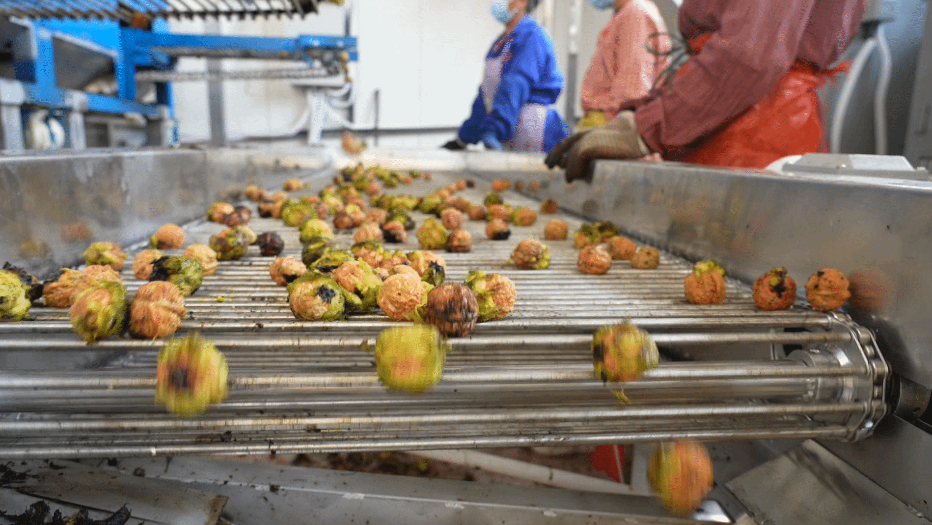 节约所得的成本,大部分都直接补助在了果农的身上,杨自成每斤多出的2角钱就是这么来的。收购到的嫩核桃,工人们直接倒入机器入口,通过传送带依次经过脱青皮、清洗、烘干、分级、包装等精细化处理,整条生产线运行状况良好,生产效率及产品质量均达到预期指标。