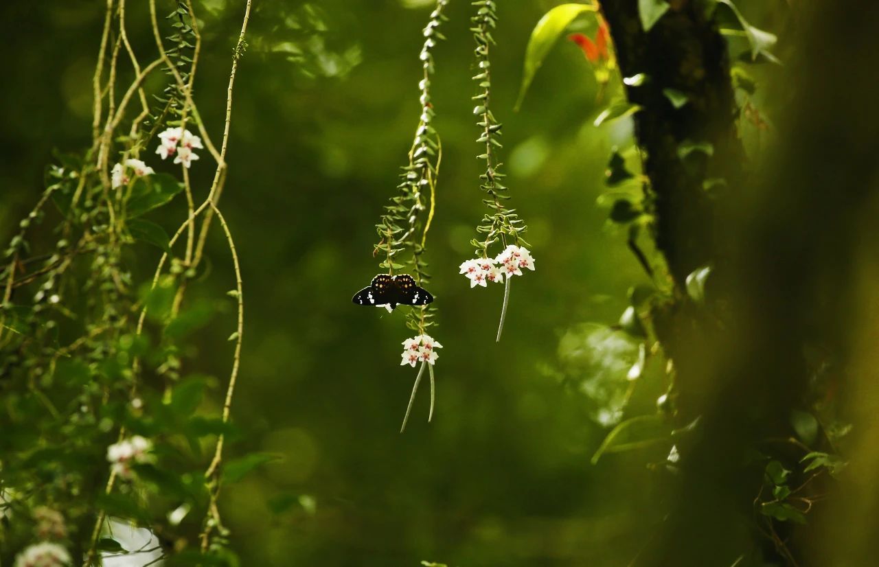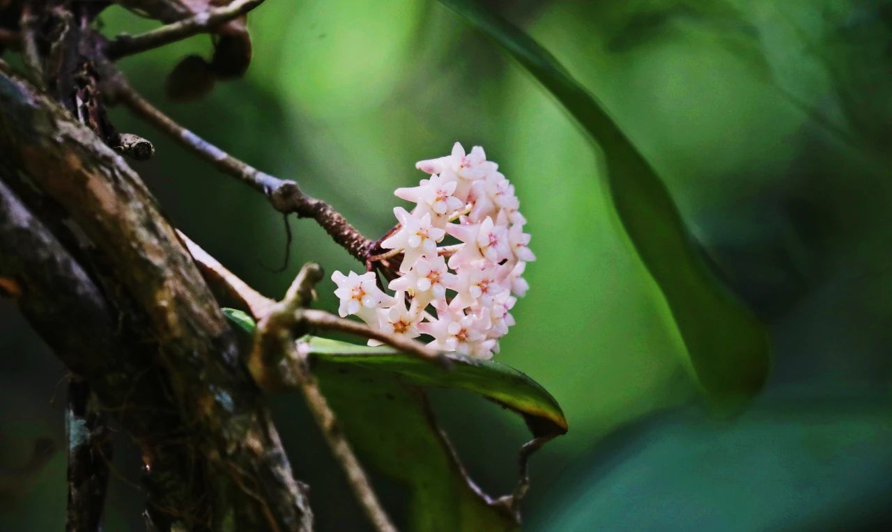 恩格勒球兰是夹竹桃科球兰属的多年生悬垂藤本植物,花期通常在每年的9月至10月,这些“球兰花”,也成为当地秋天的“另一种打开方式”。在拍摄的画面中,在人迹罕至的原始森林中,一朵朵、一簇簇晶莹剔透的恩格勒球兰花缀满藤蔓、随风摇曳,伴着秋风散发着淡淡的花香。凑近看,五星形的主花冠洁白无瑕,尤其是副花冠上那五枚紫色的晶体,红里透紫,紫里透亮,犹如一颗颗天然形成的紫水晶,格外漂亮。
