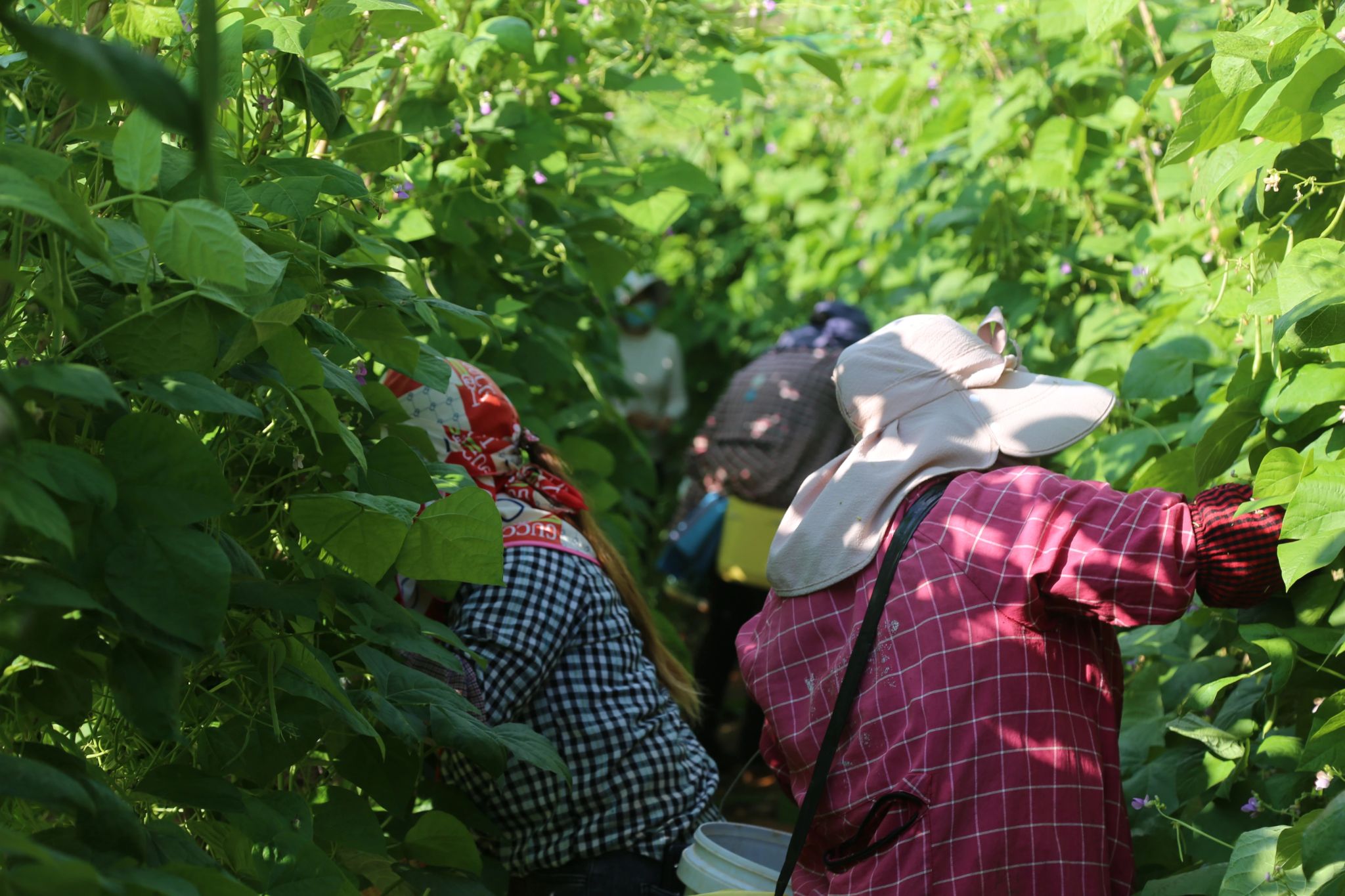 走进无筋豆种植地块,只见藤蔓上结满了大大小小的豆子,细嫩的藤尖正在豆架上伸肢展臂,紫色的豆花上蜂飞蝶舞,一派生机勃勃的景象。豆农们穿梭在地里,忙着采摘、分拣成熟度好的豆子,趁着好价钱卖给收购商。
