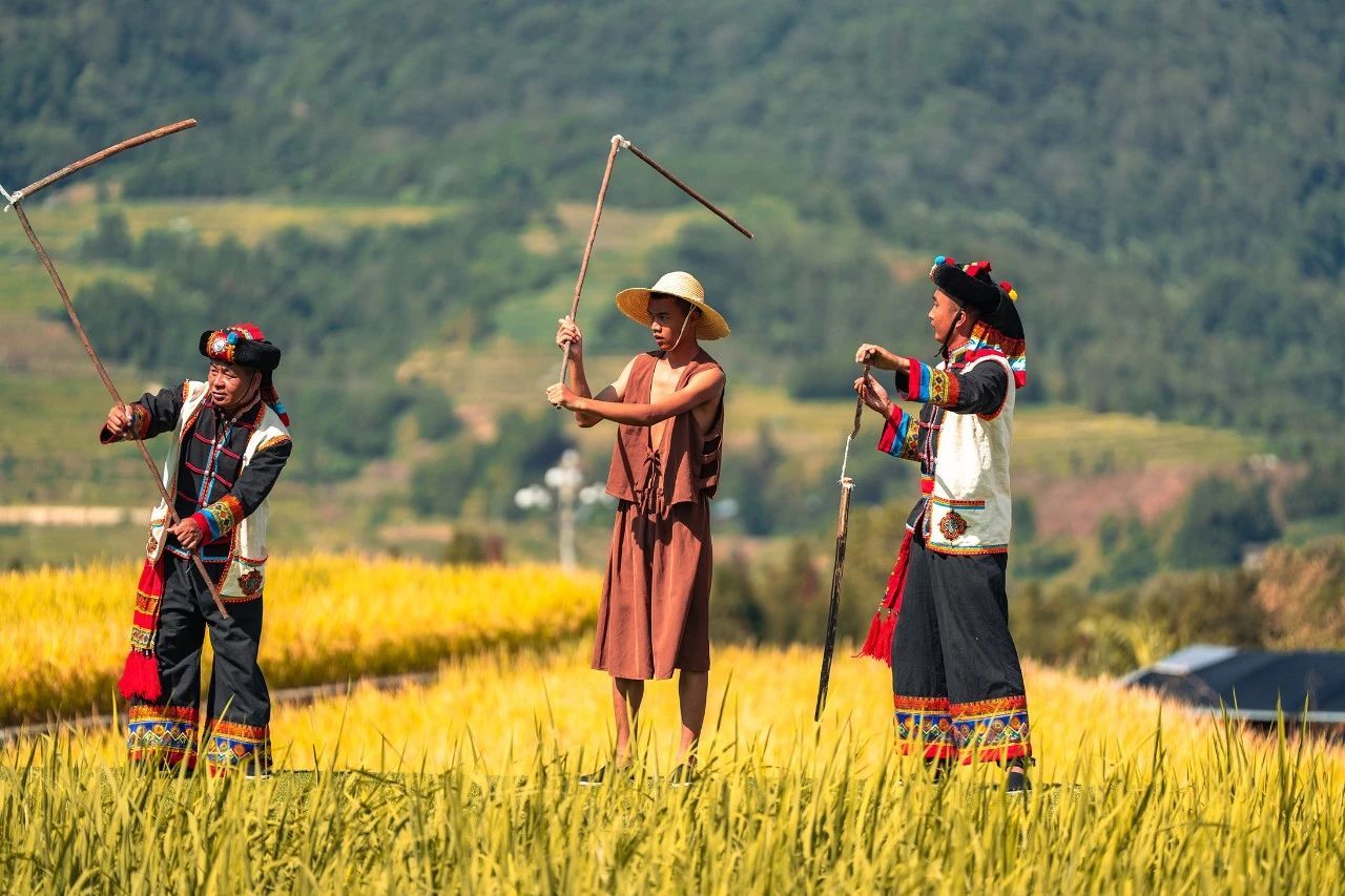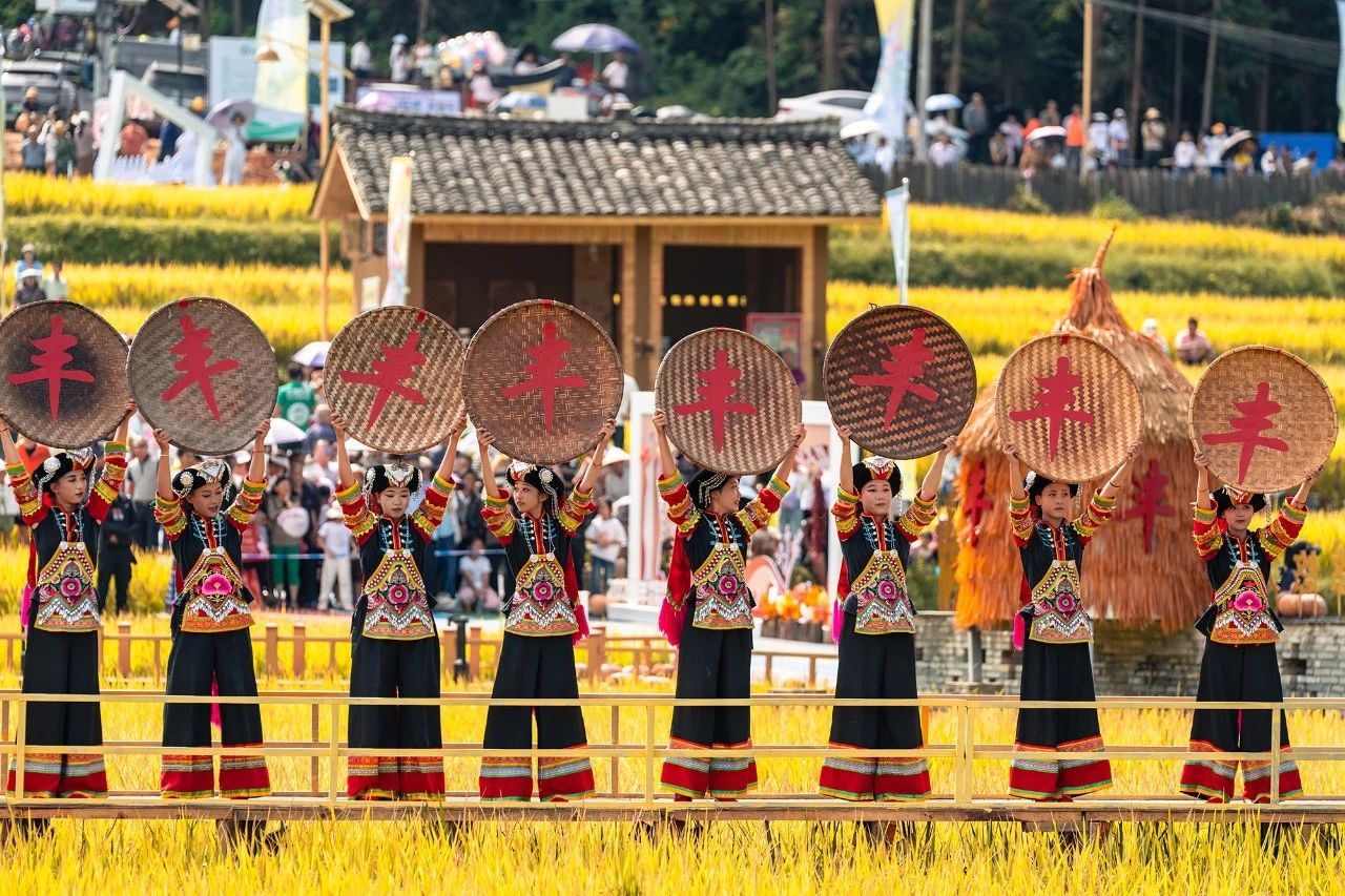活动现场,丰富多彩的文艺节目轮番上演,将丰收的喜悦传递给每一个人。随着民俗情景剧《开源》的震撼上演,丰收节的序幕被缓缓拉开。在金色的稻田公园里,一丘丘田埂上,演员们身着当地民族传统服饰,以生动的表演再现了农民们勤劳奋斗、创造美好生活的场景。农耕乐器舞蹈《田园欢歌》以其独特的魅力征服了全场观众,那些看似平凡的农具在艺术家们的手中仿佛被赋予了生命,奏出了乡村生活的最美旋律。而民族传统丰收歌《和和美美庆丰收》更是将现场气氛推向了高潮,歌声中充满了对丰收的喜悦和对未来的憧憬。