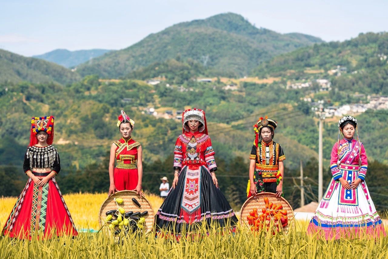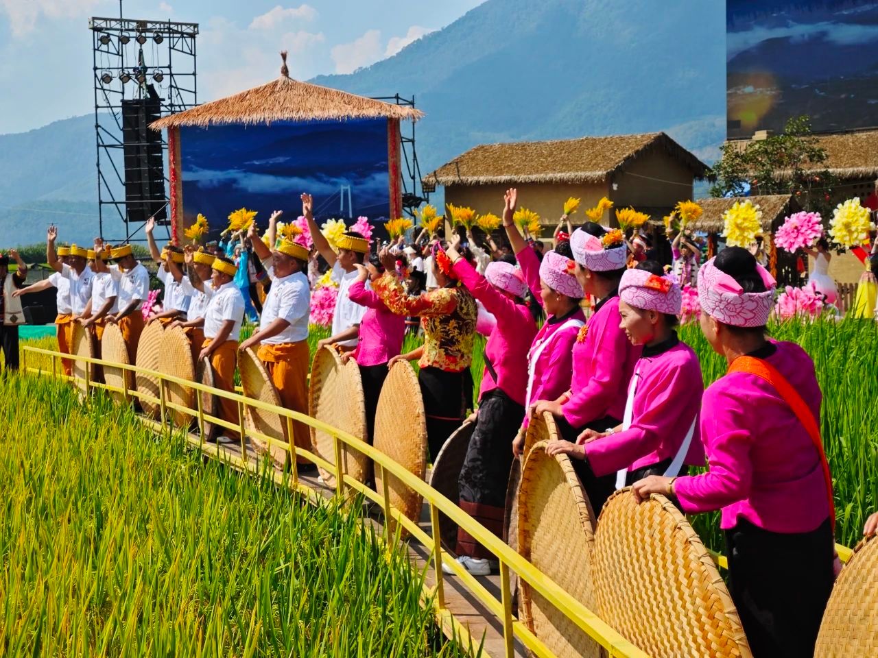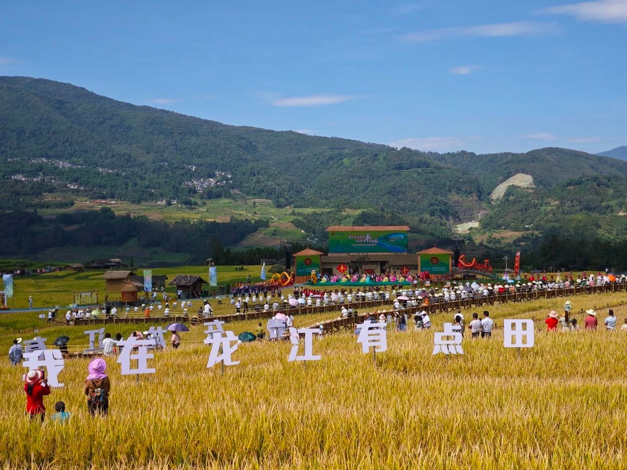 在龙陵县龙江稻田公园内,万亩稻田犹如一幅流动的金色画卷。阳光下,稻田闪烁着耀眼的光芒,与远处青山相映成趣,构成了一幅和谐共生的田园风光。在这片希望的田野上,每一处风景都讲述着乡村振兴的生动故事,每一处细节都透露出新时代的农村魅力。各级领导嘉宾、媒体记者、文艺工作者及游客们齐聚一堂,共同见证这一壮观景象,感受乡村振兴带来的巨大变化。稻田间,传统与现代交织,农耕文化与科技创新相互辉映,展现了新时代农村的新面貌。从喜庆丰收田野直播到丰收乐章乡村文艺大联欢,从学用“千万工程”成果展到薪火传承农耕博物展,从“绿色云品”特色市集到欢乐田野趣味运动会,通过一系列丰富多彩的群众性活动,让乡村“美起来”,丰收盛会“热起来”,人民群众“笑起来”。