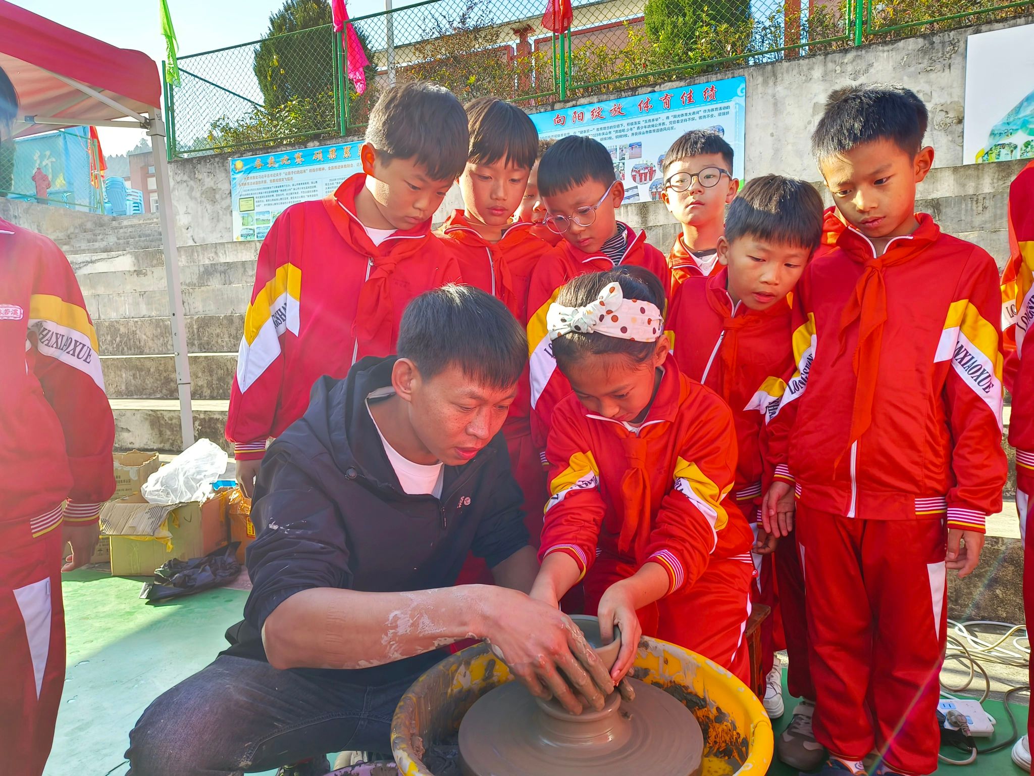 非遗活态展示区也颇具特色,历史悠久的镇安土陶、制作精巧的龙江面塑、色彩斑斓的平达傈僳族服饰、工艺精细的象达纸伞、充满趣味的木城打陀螺等等,此刻非遗成了“具象化”吸引了很多同学的驻足围观,大家好奇地了解非遗,用指尖触碰非遗产品。“我以为土陶制作很简单,但是用手捏的时候才知道很有技巧,觉得非常神奇,一件艺术品就在自己的思想和手里变出来了”学生赵思阳高兴地说道。“我最喜欢的是打陀螺,一直抽陀螺就一直转,体现了劳动人民的智慧,我觉得太有趣了。”学生杨皓天玩得不亦乐乎。