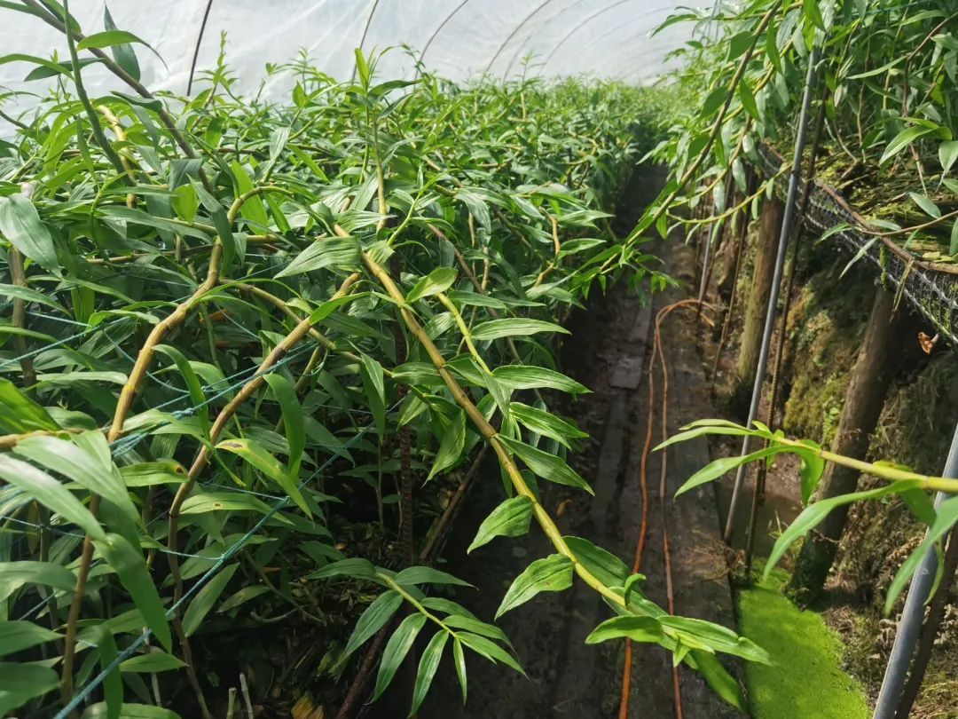 龙陵县种植石斛历史悠久,二十世纪九十年代初期,开始人工种植石斛,开创了床式种植、独横木种植、林下仿野生种植等多种模式。近年来,龙陵县把石斛产业作为百亿元特色产业来打造,聚集产业培育、标准制定、品牌打造、产品研发、科技创新、产业延伸等,全力将石斛产业发展成了全县的特色支柱产业。目前,全县石斛种植面积达4.6万亩,年产鲜条1.3万余吨,龙陵紫皮石斛种植面积及产量均占全国的70%和全省的80%以上,培育了137个市场主体、带动88个村(社区)6000余户种植专业户、7.5万余人直接或间接从事石斛产业,从业人员占全县总人口24.5%以上,人均年收入达7600余元,为斛农和相关从业者巩固拓展脱贫攻坚成果、助推乡村振兴提供保障。