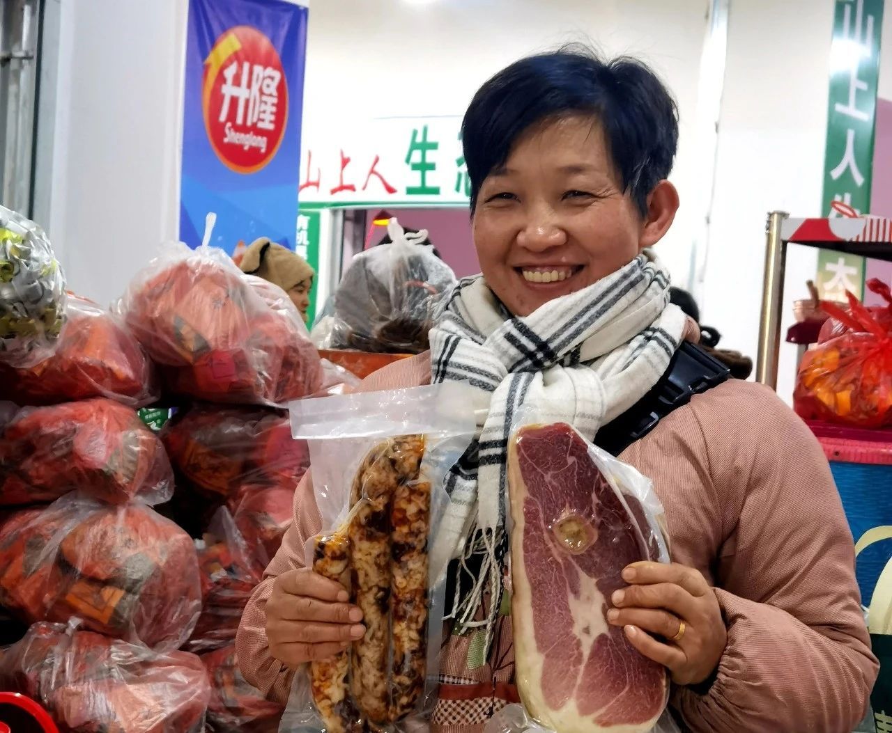 今年45岁的闫丽华家住龙陵县龙山镇户孔村,是做当地传统腌腊的一把好手。2023年,她在县城农贸市场租赁摊位开始售卖土特产,并依靠腌腊绝活做成了自家的一门生意。