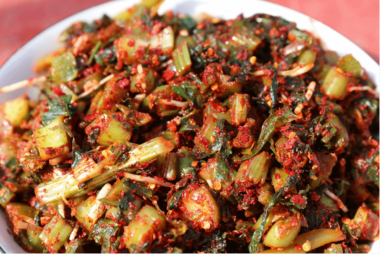 谈及如何做出美味的腊腌菜,闫丽华滔滔不绝地说道:“将大青菜晾晒三天后,切成小段揉熟搓透,清洗干净沥干水分,然后放入盐巴、八角、花椒、白砂糖、辣椒面,再放入苤菜根,可以增香,还有自家酿的甜白酒,能促进腌菜更好地发酵。将各种各样的佐料和青菜充分拌匀后,再放进土罐里压紧压实,放在阴凉处保存即可。”