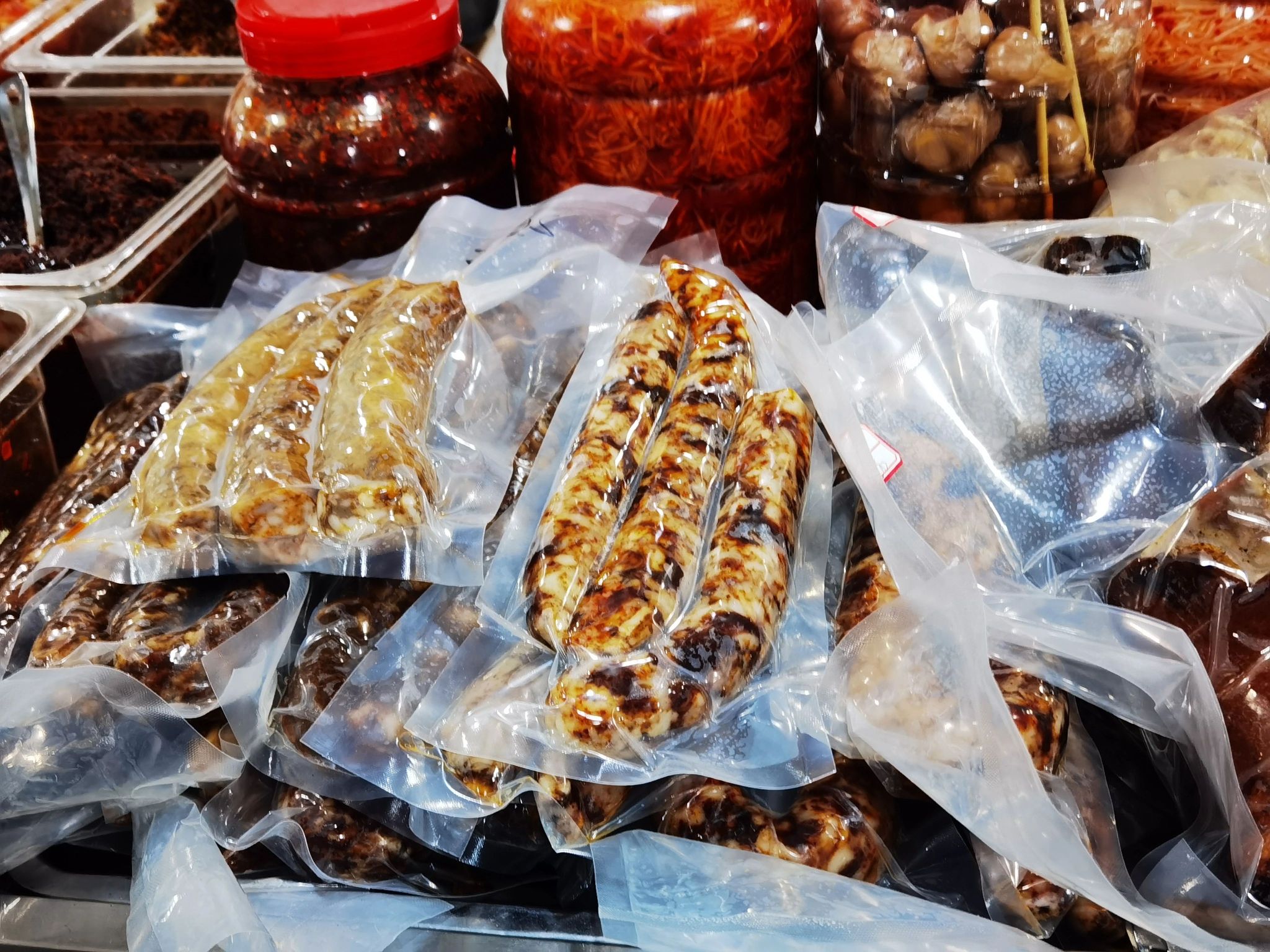 市民赵丽芳每年都要和闫丽华购买一些腌腊作为“年货”送给外地的亲朋好友。她说自己的腌腊技术不行,腌制出来不好吃,有时还浪费了食材,于是这几年都来市场购买正宗的龙陵腌腊,而闫丽华的手艺便是她信得过的。赵丽芳还说闫丽华的腌腊保留了传统味道,火腿香、口感好,她给深圳、广东的朋友带过去,也都特别喜欢吃。煮鸡、煮鸭、煮鹅时放上龙陵腊猪脚,格外提味;龙陵的豆腐肠、肉肠可以蒸、可以煎、可以煮,也相当好吃。
