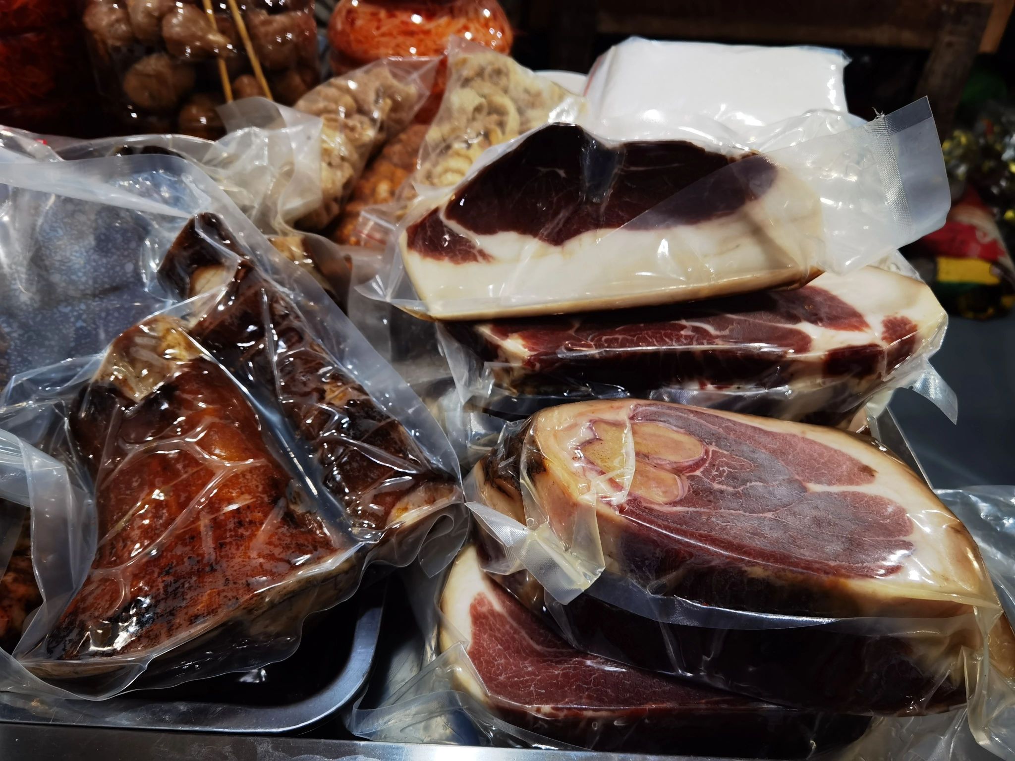 除了腊腌菜,腌火腿、腊猪脚、辣子肉、腊肠等荤腌腊也是闫丽华小店里的“宝贝”,她每年要腌制50多个火腿、80多只猪脚、数百斤辣子肉和腊肠。