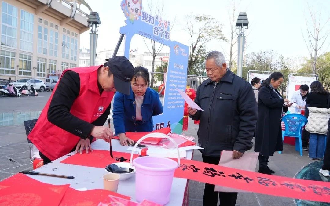 在活动现场,市民前往健康义诊、年画展、非遗拓印、科普宣传、新春图书展等服务区体验。在春联书写区,小书法志愿者和书法家们早早摆开书案,备好笔墨纸砚,挥毫间墨香四溢,笔锋游走如龙蛇蜿蜒,“富贵平安百福来,吉祥如意万事兴”等饱含新春祈愿的联句、“福”字跃然眼前,前来领取春联的群众络绎不绝,热闹非凡。