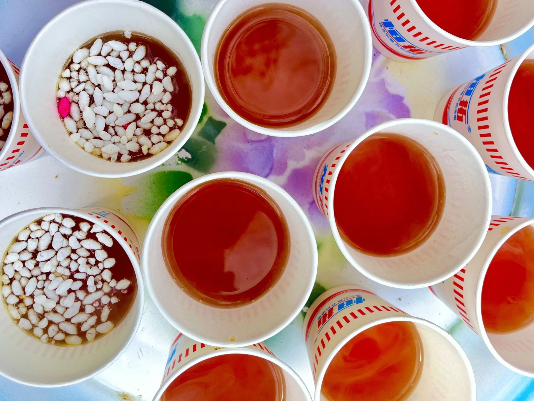 在寒冷的冬日里,一家人围坐在火炉旁,将零散的米花放入杯子里,加入刚刚熬好的热糖水,浸泡至米花微微膨胀,一碗热气腾腾的米花糖水就大功告成了。
