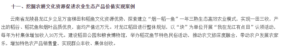 农业生态产品是生态产品的重要组成部分,推进农业生态产品价值实现是推动农业绿色发展、促进农民增收的重要举措。龙陵县一直以来都致力于推动农业现代化转型,此次入选的《挖掘农耕文化资源促进农业生态产品价值实现案例》,立足发挥龙江得天独厚的自然资源优势和传统的稻鱼节文化,积极探索其中实施“烟+稻+鱼”一年三熟模式,通过发展绿色高效农业,生态种养,建设稻田公园和粮食博物馆、举办稻花鱼节等方式传承稻鱼文化,实现粮经同发展的同时带动乡村旅游业发展,为全国农业发展提供了宝贵的经验借鉴。