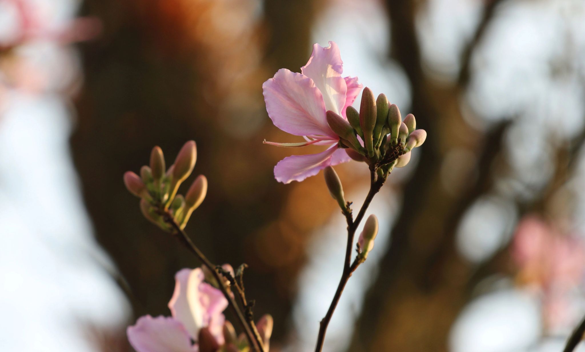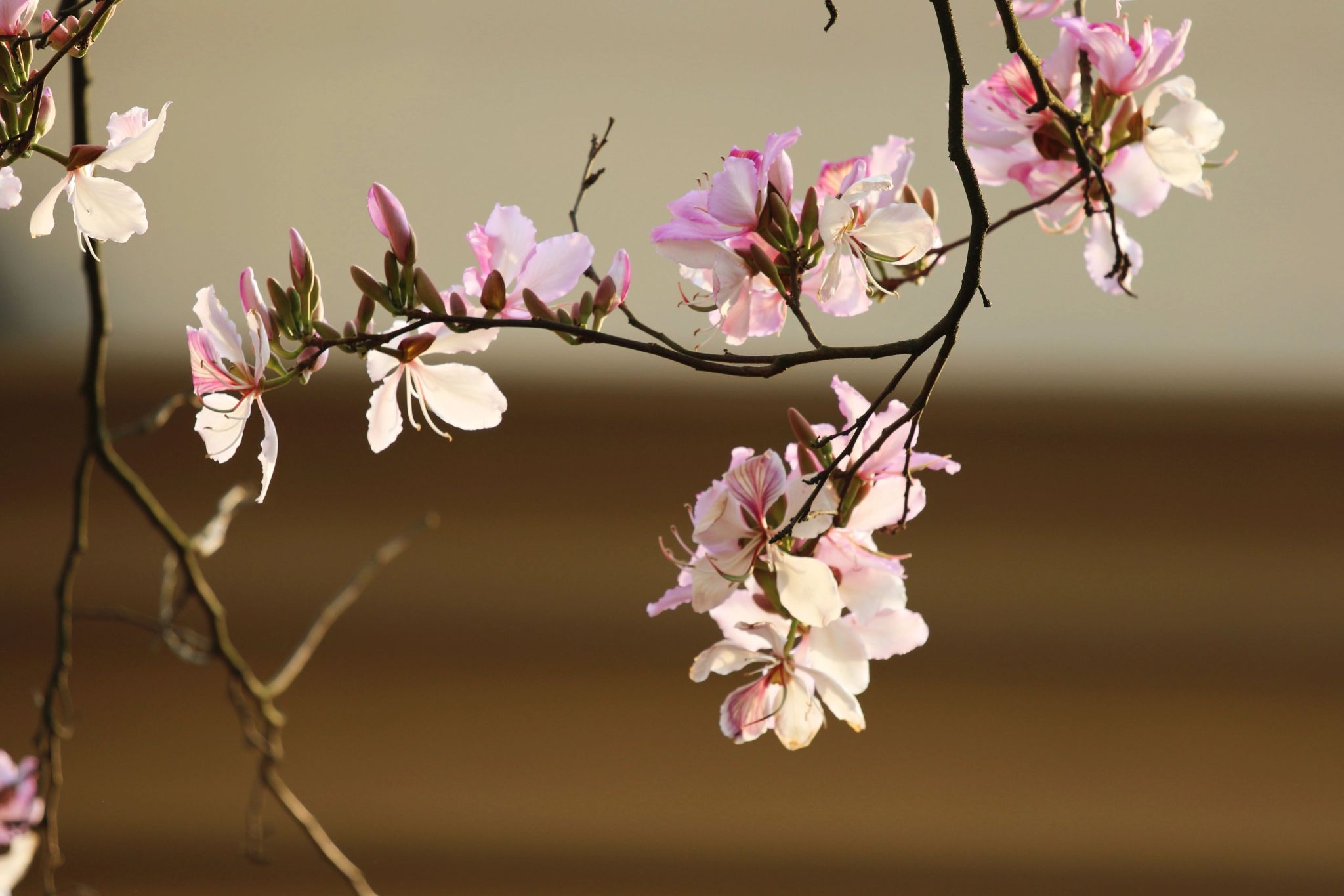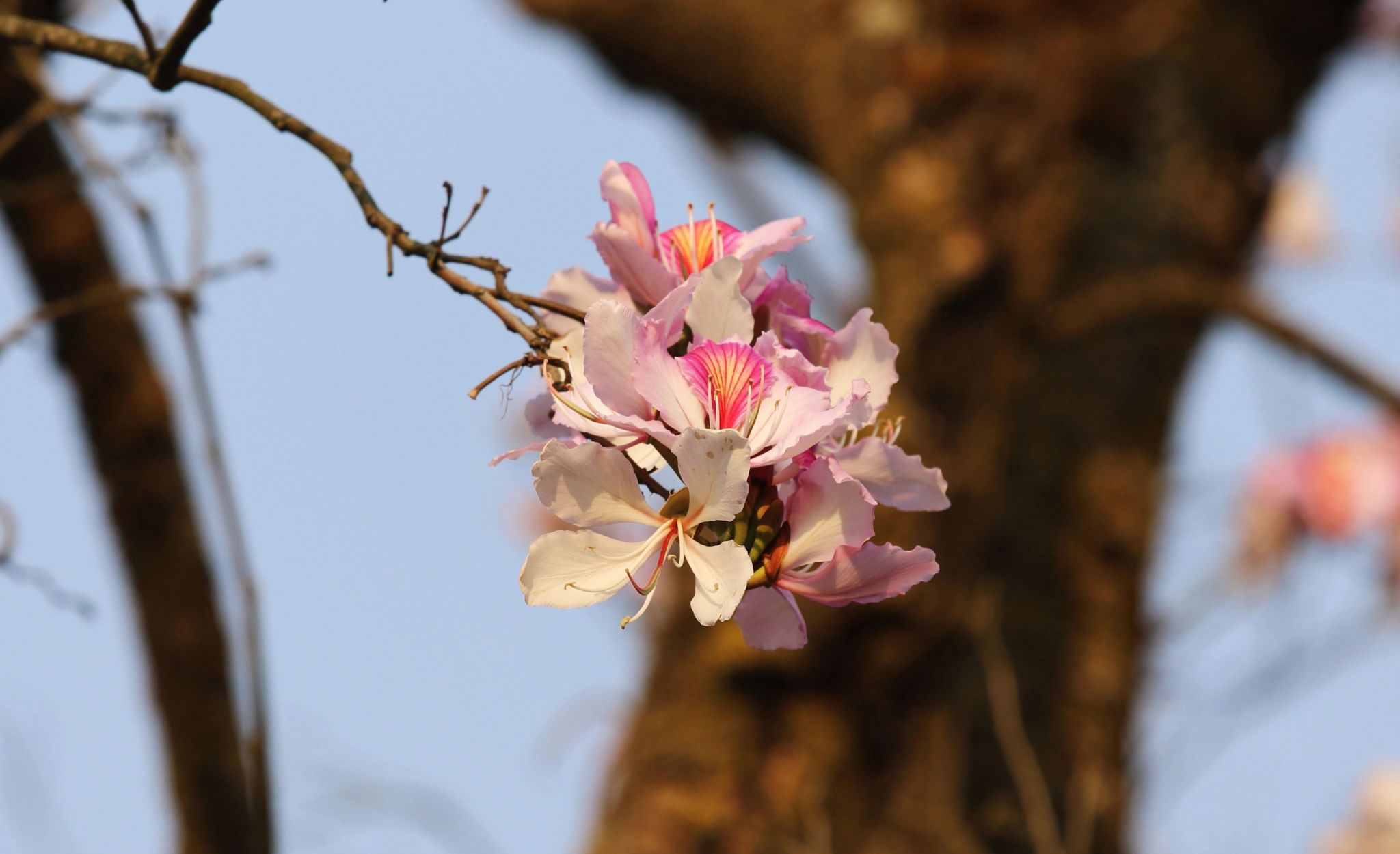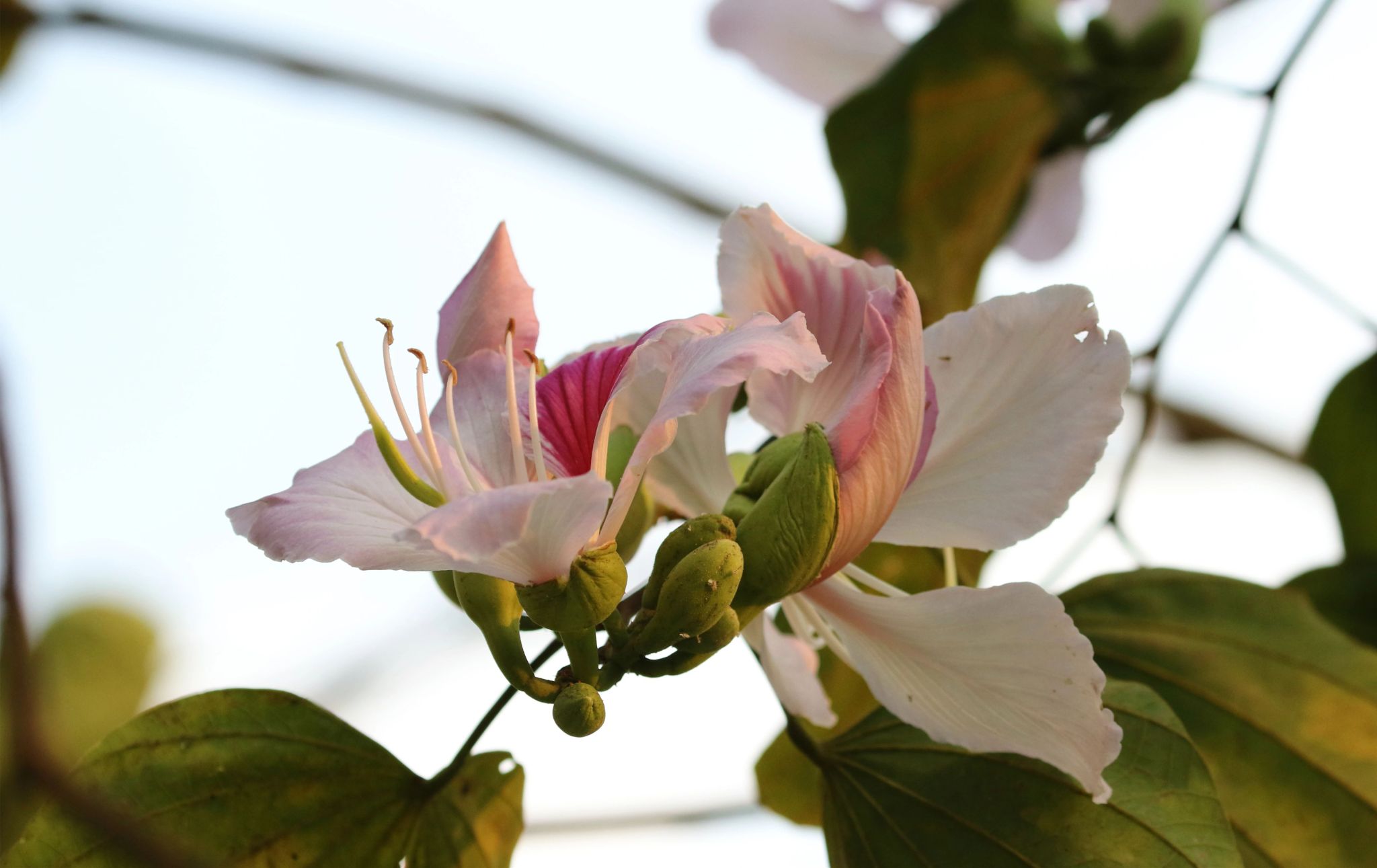 白花羊蹄甲的花序为总状或伞房状,密集。花朵以白色、粉红、紫红等为主色调,倒卵状的五枚花瓣四白一紫红,其中四枚分列两侧,另一枚带有孔雀尾巴纹理图样的粉红色花瓣,格外好看和显眼。其常见于温暖湿润、阳光充足的气候环境中,花色会随着光照、花期的变化而变化,可谓是“娇容三变”。