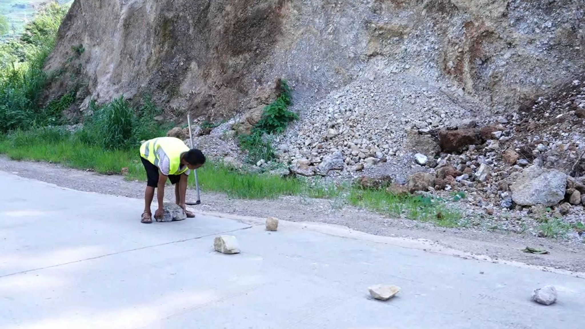 龙陵县地处横断山脉,道路多为沿山修建,地质构造复杂,岩层破碎,每年降雨集中时,极易发生滑坡和落石风险,给群众出行带来不便。为此,龙陵县交通运输局组织道路养护队伍全员上岗,分片负责道路巡查和抢险。道路养护人员郭押新一边清理道路上的碎石一边说:“我们每天都来看看有没有塌方,遇到大的塌方我们往上报,小的塌方就自己清理,方便群众通行。”