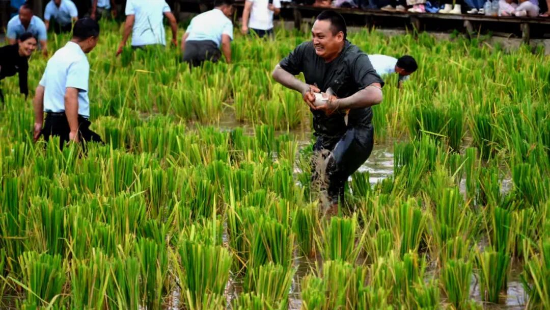 午后的稻田公园,雨水丝毫没浇灭现场的热闹劲儿。捉鱼比赛、徒手捉鱼体验在稻田间火热开场,参赛者挽着裤腿踩进田里,雨水混着泥水溅满衣裤,却挡不住追逐稻花鱼的欢腾——有人俯身追鱼,有人伸手合围,笑声、欢呼声裹着雨丝荡漾在绿水青山间。