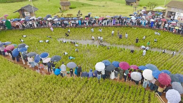 走进龙江乡的梯田,金色稻浪在秋风中起伏,清甜稻香裹挟水汽扑面而来。游客们或在田埂上以稻海为背景拍照定格美景,或挽起裤脚、赤脚踏入水田,化身“捉鱼选手”参与徒手摸鱼竞技。欢呼声、加油声此起彼伏,热闹非凡。