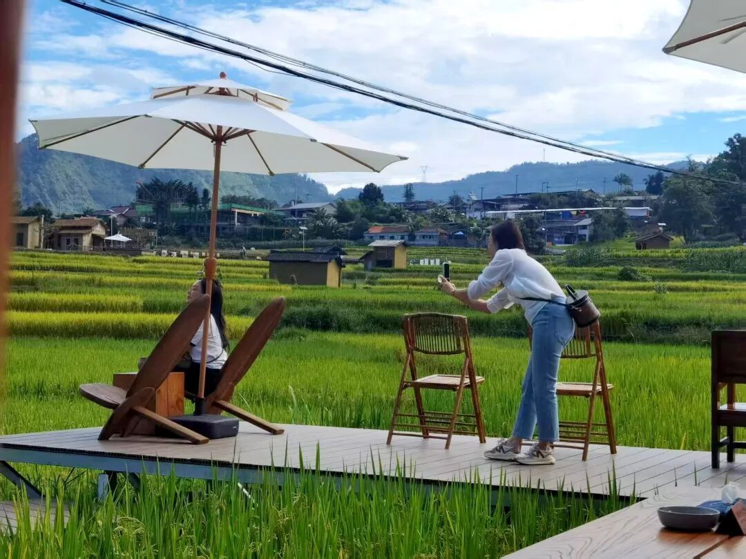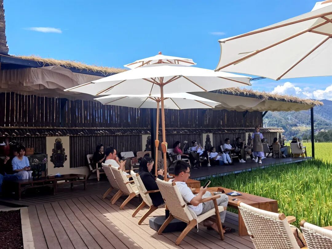 稻田公园里新建的龙江·村咖——牛棚咖啡屋也成了游客们歇脚的好去处。远处绿水青山、近处稻浪飘香,手捧一杯龙陵高海拔精品咖啡,一切变得不一样。来自昆明的周女士一边品尝招牌稻香拿铁,一边感慨:“赏着美景,闻着稻香,吹着清风,连咖啡的味道都变得特别,人在这儿格外放松,仿佛喝出了咖啡的最佳口感。”据咖啡屋主理人杨萌介绍,国庆期间客流量达往日的两到三倍,每日接待游客约上千人,营业额稳定在万元以上,已然成为乡村游的热门打卡点。